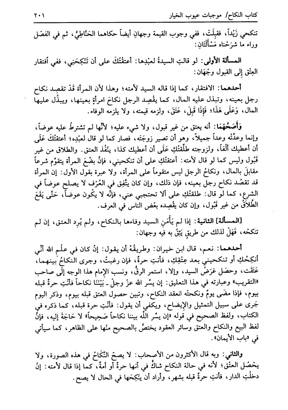 أحدهما: نعم، قال ابن خيران: وطريقُهُ أن يقول: إنْ كان في علْمِ الله أنِّي أنكِحُكِ أو تنكحيني بعد عِتْقِكِ، فأنتِ حرةٌ، فإن رغبتُ، وجرى النكاحُ بينهما، عَتَقَت، وحصَل غرَضُ السيد، وإلا، استمر الرقُّ، ونسب الإِمام هذا الوجه إلَى صاحب "التقريب" وعبارته في هذا التعليق: إن يسَّر الله عَزَّ وَجَلَّ -بَيْنَنَا نكاحاً فأنْتِ حرةٌ قبله بيوم، فإذا مضَى يومٌ ونكحتْه انعقد النكاح، وتبين حصول العتق قبله بيوم، وذكر اليوم جَرى على سبيل التمثيل والإِيضاح، ويكفي أن يقول: فأنْتِ حرة قبله، كما ذكره في الكتاب، ولفظ الصحيح في قوله "إن يسَّر الله بيننا نكاحاً صَحِيحاً" لا حَاجَةَ إليه، فإنَّ لفظ البيع والنكاح والعتق وسائر العقود يختصُّ بالصحيح منها على الظاهر، كما سيأتي في "باب الأيمان".