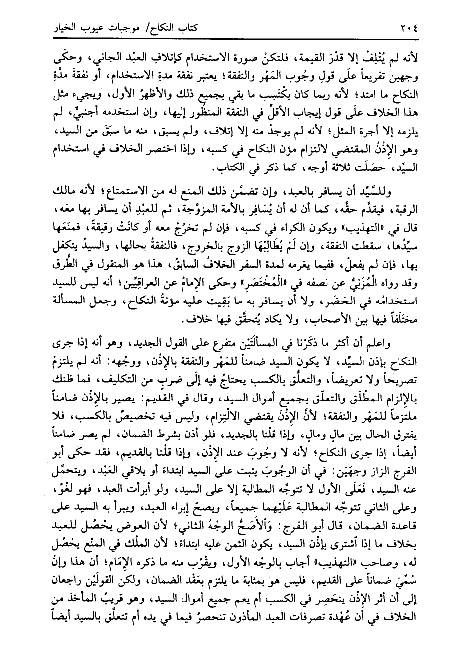 واعلم أن أكثر ما ذكَرْنا في المسألَتَيْن متفرع على القول الجديد، وهو أنه إذا جرى النكاح بإذن السيِّد، لا يكون السيد ضامناً للمَهْر والنفقة بالإِذْن، ووجْهه: أنه لم يلتزمْ تصريحاً ولا تعريضاً، والتعلُّق بالكسب يحتاجُ فيه إلَى ضربٍ من التكليف، فما ظنك بالإلزام المطْلَق والتعلّق بجميع أموال السيد، وقال في القديم: يصير بالإذْن ضامناً ملتَزماً للمَهْر والنفقة؛ لأنَّ الإذْنَ يقتضي الالْتِزام، وليس فيه تخصيصٌ بالكَسب، فلا يفترق الحال بين مالٍ ومالٍ، وإذا قلْنا بالجديد، فلو أذن بشرط الضمان، لم يصر ضامناً أيضاً، إذا جرى النكاح؛ لأنه لا وجُوبَ عند الإِذْن، وإذا قلْنا بالقديم، فقد حكى أبو الفرج الزاز وجهَيْن: في أن الوجُوبَ يثبت علىَ السيد ابتداءً أو يلاقي العَبْد، ويتحمَّل عنه السيد، فَعَلَى الأول لا تتوجَّه المطالبة إلا على السيد، ولو أبرأت العبد، فهو لغْوٌ، وعلى الثاني تتوجَّه المطالبة عَلَيْهما جميعاً، ويصحّ إِبراء العبد، ويبرأ به السيد على قاعدة الضمان، قال أبو الفرج: وَالأَصَحُّ الوجْهُ الثاني؛ لأن العوض يحْصُل للعبد بخلاف ما إذا اشترى بإذْن السيد، يكون الثمن عليه ابتداءً؛ لأن الملْك في المنْع يحْصُل له، وصاحب "التهذيب" أجاب بالوجْه الأول، ويقْرُب منه ما ذكره الإمَام؛ أن هذا وإنْ سُمِّيَ ضماناً على القديم، فليس هو بمثابة ما يلتزم بعَقْد الضمان، ولكَن القولَيْن راجعان إلى أن أثر الإِذْن ينحَصِر في الكسب أم يعم جميع أموال السيد، وهو قريبُ المأخذ من الخلاف في أَن عُهْدة تصرفات العبد المأذون تنحصرُ فيما في يده أم تتعلَّق بالسيد أيضاً