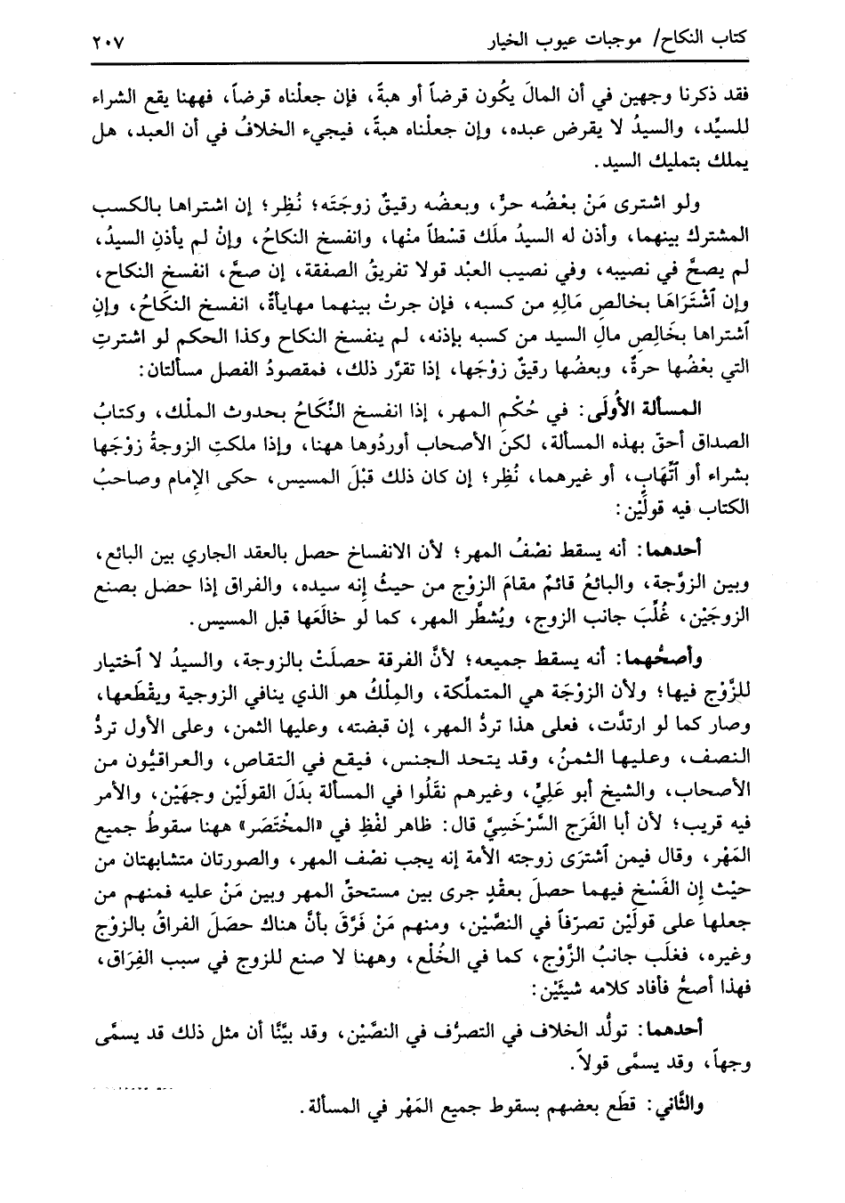 المسألة الأُولَى: في حُكْمِ المهر، إذا انفسخ النِّكَاحُ بحدوث الملك، وكتابُ الصداق أحقّ بهذه المسألة، لكن الأصحاب أوردُوها ههنا، وإذا ملكتِ الزوجةُ زوْجَها بشراء أو اتِّهَاب، أو غيرهما، نُظِر؛ إن كان ذلك قبْلَ المسيس، حكى الإِمام وصاحبُ الكتاب فيه قولَيْن:
