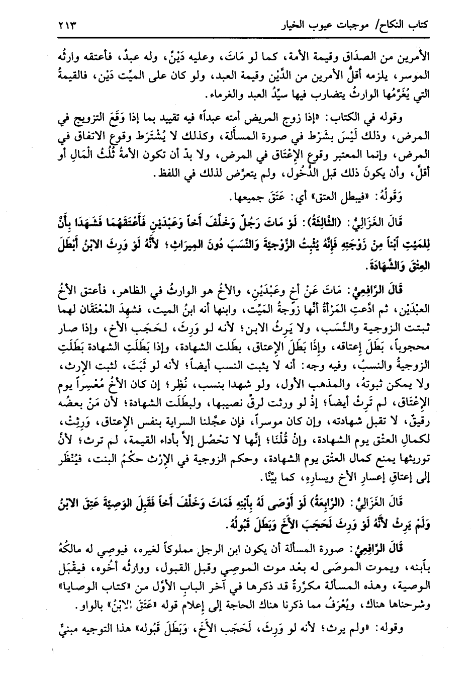 قَالَ الرَّافِعِيُّ: مَاتَ عَنْ أخٍ وعَبْدَيْنِ، والأخُ هو الوارثُ في الظاهر، فأعتق الأخُ العبْدَيْن، ثم ادَّعتِ المَرْأةُ أنَّها زوجةُ المَيِّت، وابنها أنه ابنُ الميت، فشهِدَ المُعْتَقَان لهما ثبتت الزوجية والنَّسَب، ولا يَرِثُ الابن؛ لأنه لو وَرِثَ، لحَجَب الأخ، وإذا صار محجوباً، بَطَلَ إِعتاقه، وإِذَا بَطَلَ الإعتاق، بطَلت الشهادة، وإذا بَطَلَتِ الشهادة بَطَلَتِ الزوجيةُ والنسبُ، وفيه وجه: أنه لَا يثبت النسب أيضاً؛ لأنه لو ثَبَتَ، لثبت الإِرث، ولا يمكن ثبوتهُ، والمذهب الأول، ولو شهدا بنسب، نُظِر؛ إن كان الأخُ مُعْسِراً يوم الإِعْتَاق، لم تَرِثْ أيضاً؛ إذ لو ورثت لرقِّ نصيبها، ولبطَلَت الشهادة؛ لأن مَنْ بعضُه رقيقٌ، لا تقبل شهادته، وإن كان موسراً، فإن عجَّلنا السراية بنفس الإِعتاق، وَرِثتْ، لكمالِ العتْق يوم الشهادة، وإن قُلْنَا؛ إنها لا تحْصُل إلاَّ بأداء القيمة، لم ترث؛ لأنَّ توريثها يمنع كمال العتْق يوم الشهادة، وحكم الزوجية في الإرْث حكْمُ البنت، فيُنْظَر إلى إعتاقِ إعسارِ الأخ ويسارِهِ، كما بيَّنَّا.