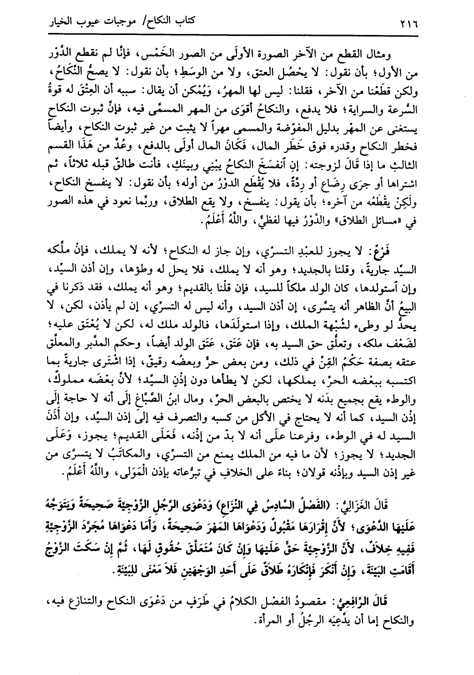 ومثال القطع من الآخر الصورة الأولَى من الصور الخَمْس، فإنَّا لم نقطع الدَّوْر من الأول؛ بأن نقول: لا يحْصُل العتق، ولا من الوسَطِ؛ بأن نقول: لا يصحُّ النِّكَاحُ، ولكن قطَعْنا من الآخر، فقلنا: ليس لها المهرُ، وَيُمْكن أن يقال: سببه أن العِتْقَ له قوةُ السُّرعة والسراية؛ فلا يدفع، والنكاحُ أقوَى من المهر المسمَّى فيه، فإنَّ ثبوت النكاح يستغنى عن المهْر بدليل المفوّضة والمسمى مهراً لا يثبت من غير ثبوت النكاح، وأيضاً فخطر النكاح وقدره فوق خَطَر المال، فَكَانَ المال أولَى بالدفع، وعُدَّ من هَذَا القسم الثالثِ ما إذا قَالَ لزوجته: إنِ انفسَخَ النكاحُ بينِي وبينَكِ، فأنت طالقٌ قبله ثلاثاً، ثم اشتراها أو جرَى رِضَاع أو رِدَّةٌ، فلا يُقْطَع الدوْرُ من أوله؛ بأن نقول: لا ينفسخ النكاح، ولَكِنْ يقْطَعُه من آخره؛ بأن يقول: ينفسخ، ولا يقع الطلاق، وربَّما نعود في هذه الصور في "مسائل الطلاق" والدَّوْرُ فيها لفظيٌّ، واللهُ أَعْلَمُ.