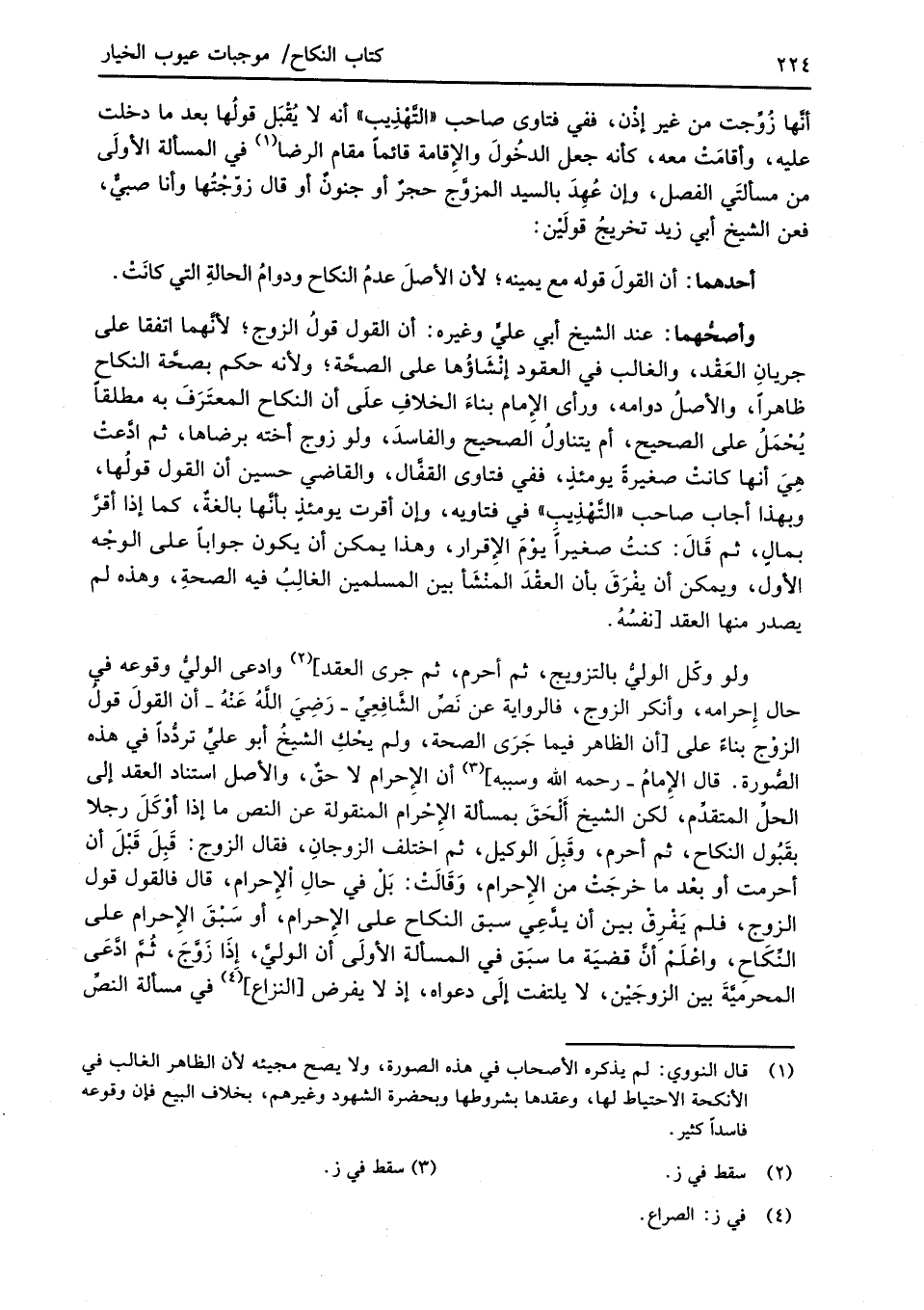 (¬1) قال النووي: لم يذكره الأصحاب في هذه الصورة، ولا يصح مجيئه لأن الظاهر الغالب في الأنكحة الاحتياط لها، وعقدها بشروطها وبحضرة الشهود وغيرهم، بخلاف البيع فإن وقوعه فاسداً كثير.