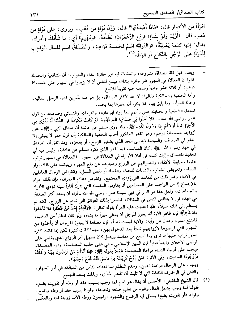 استدل الشافعية والحنابلة على رأيهم بما رواه أبو داود، والترمذي والنسائي وصححه من قول عمر -رضي الله عنه-: "لا تَغلُوا في صَدَاقِ" الخ فَإِنَّهمَا لَوْ كَانَتْ مُكْرَمَةً في الدُّنْيَا أَوْ تَقْوَى فِي الآخِرَةِ كَانَ أَوْلاَكُمْ بِهَا رَسُول الله -صلى الله عليه وسلم- وقد روى مسلم عن عائشة أن صداق النبي -صلى الله عليه وسلم- على أزواجه خمسمائة درهم، وهو القدر المذكور أجاب الحنفية والمالكية بأن قول عمر لا ينبغي إلا الغلو في الصداق، والمبالغة فيه إلى الحد الذي يضايق الزوج، أو يعجزه، وقد اتفق أن الصداق في عهد رسول الله -صلى الله عليه وسلم- كان المناسب فيه القدر الذي ذكره مسلم عن عائشة، وليس فيه أي تحديد للصداق وإليك كلمة في أذان الأولياء في المغالاة في المهور -فالمغالاة في المهور ترتب عليها مضايقة الأكفاء، وانصرافهم عن الزواج وعجزهم عن دفع المهر، ويترتب على ذلك بوار النساء، وتعريض الشباب والشابات للخنا، والفساد أو نقص النسل، وانقراض الرجال العاملين في الأمة، وغير ذلك من للفاسد التي تؤذي المجتمع، وتقوص دعائم العمران، فإن ذلك حرام بالإِجماع إذ من الواجب على المسلمين أن يقاوموا المفساد التي تترك آثاراً سيئة تؤذي الأفراد والجماعات، ولعل هذا هو السر في نهي سيدنا عمر -رضي الله عنه- أراد أن يحدد أكثر الصداق في عهده كي لا يتنافس الناس في المغالاة، فيضعوا بذلك العوائق التي تمنع عن الزواج، لكنه لم يستطع إلى ذلك سبيلاً، فَقَدِ احتجت عليه المرأة بقوله تعالى: {وَآتَيْتُمْ إِحْدَاهُنَّ قِنْطَارًا فَلَا تَأْخُذُوا مِنْهُ شَيْئًا} فإن ظاهر الآية أنه يجوز للرجل أن يعطي مهراً ما يشاء، ولو كان قنطاراً من الذهب، فامتنع عمر، وعدل عن رأيه: والآية ليست نصاً، فإن معناها لا يجوز للرجال أن يأخذوا من المهور التي فرضوها لأزواجهم شيئاً بعد الدخول بهن، مهما كانت كثيرة لكن إذا كانت كثرة المهر ترتب عليها ما نرى وما نسمع من مفاسد ورذائل كان تسهيل أمر الزواج الذي يقضي على فوضى الأخلاق واجباً دينياً فإن الدين الإِسلامي مبني على جلب المصلحة، ودرء المفسدة، فيجب على أولياء النساء مراعاة المصلحَة عَمَلاً بقوله -صلى الله عليه وسلم- "إِذَا أَتاَكُمْ مَنْ تَرْضُونَ دِيْنَهُ وَخُلُقَهُ فَزَوَّجُوهُ" الحديث، وفي الأثر: "مَنْ زَوَّجَ كَرِيْمَتَهُ مِنْ فَاسِقٍ فَقْدَ قَطَعَ رَحِمَها".