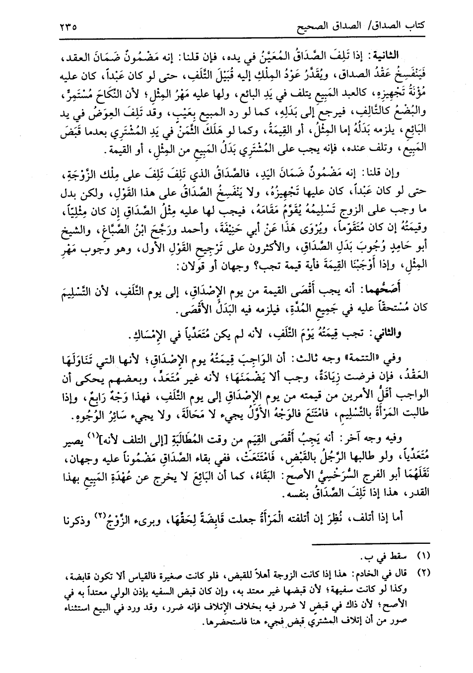 وإن قلنا: إنه مَضْمُونٌ ضَمَانَ اليَدِ، فالصَّدَاقُ الذي تَلِفَ تَلِفَ على مِلْك الزَّوْجَةِ، حتى لو كان عَبْداً، كان عليها تَجْهِيزُهُ، ولا يَنْفَسِخُ الصَّدَاقُ على هذا القَوْلِ، ولكن بدل ما وجب على الزوج تَسْلِيمُهُ يُقَوَّمُ مَقامَهُ، فيجب لها عليه مِثْلُ الصَّداقِ إِن كان مِثْلِيّاً، وقيمَتُهُ إن كان مُتَقَوّماً، وُيرْوَى هَذا عَنْ أبي حَنِيْفَةَ، وأحمد ورَجَّحَ ابْنُ الصَّبَّاغِ، والشيخ أبو حامِدٍ وُجُوبَ بَدَلِ الصَّدَاقِ، والأكثرون على تَرْجِيحِ القَوْلِ الأول، وهو وجوب مَهْرِ المِثْلِ، وإذا أَوْجَبْنَا القِيمَةَ فأية قيمة تجب؟ وجهان أو قولان: