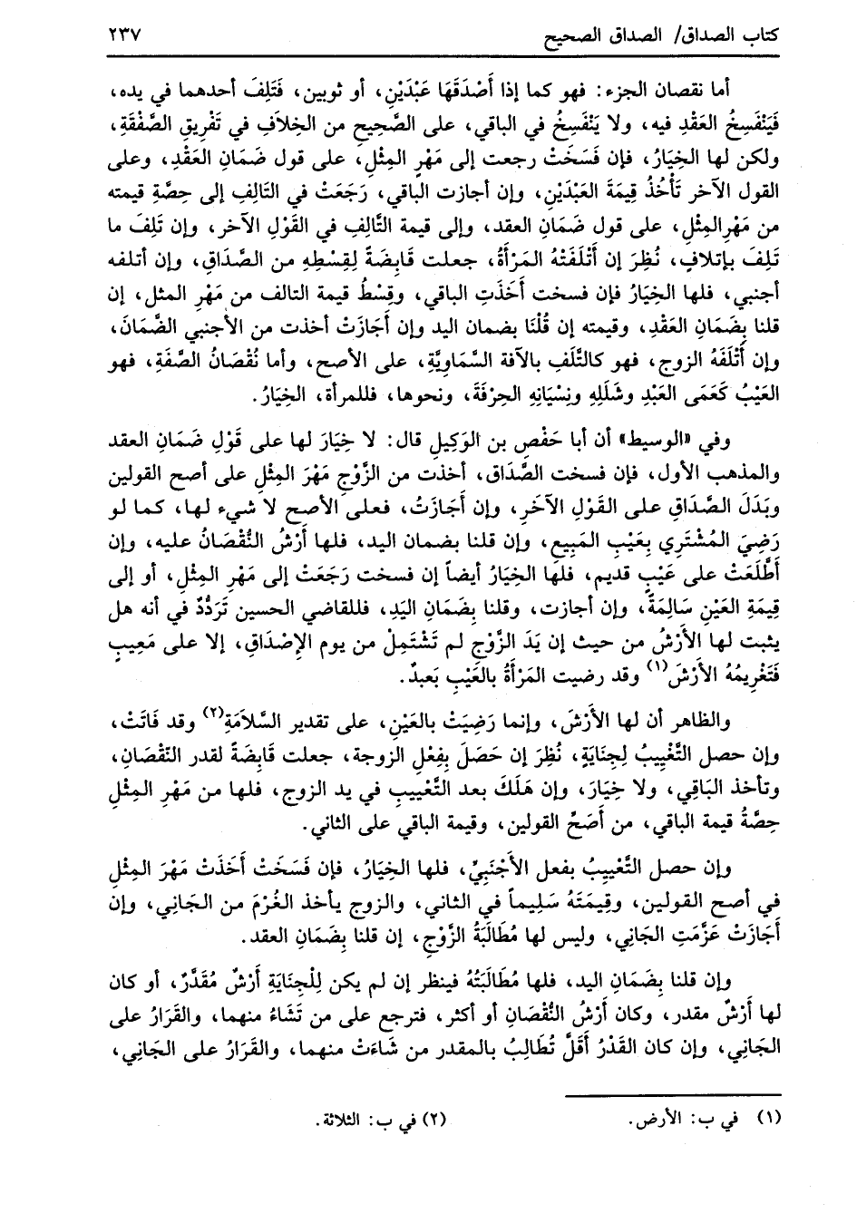 أما نقصان الجزء: فهو كما إذا أَصْدَقَها عَبْدَيْنِ، أو ثوبين، فَتَلِفَ أحدهما في يده، فَيَنْفَسِخُ العَقْدِ فيه، ولا ينْفَسِخُ في الباقي، على الصَّحيحِ من الخِلاَفِ في تَفْرِيقِ الصَّفْقَةِ، ولكن لها الخِيارُ، فإن فَسَخَتْ رجعت إلى مَهْر المِثْلِ، على قول ضَمانِ العَقْدِ، وعلى القول الآخر تَأخذُ قِيمَةَ العَبْدَيْنِ، وإن أجازت الباقي، رَجَعَتْ في التَالِفِ إلى حِصَّةِ قيمته من مَهْرِ المِثْلِ، على قول ضَمانِ العقد، وإلى قيمة التَّالِفِ في القَوْلِ الآخر، وإن تَلِفَ ما تَلِفَ بإتلافٍ، نُظِرَ إن أَتْلَفَتْهُ المَرْأَةُ، جعلت قابِضَةً لِقِسْطِهِ من الصَّدَاقِ، وإن أتلفه أجنبي، فلها الخِيارُ فإن فسخت أَخَذَتِ الباقي، وقِسْطُ قيمة التالف من مَهْرِ المثل، إن قلنا بضَمَانِ العَقْدِ، وقيمته إن قُلْنَا بضمان اليد وإن أَجَازَتْ أخذت من الأجنبي الضَّمَانَ، وإن أَتْلَفَهُ الزوج، فهو كالتَّلَفِ بالآفة السَّمَاوِيَّةِ، على الأصح، وأما نُقْصَانُ الصَّفَةِ، فهو العَيْبُ كَعَمَى العَبْدِ وشَلَلِهِ ونِسْيَانِهِ الحِرْفَةَ، ونحوها، فللمرأة، الخِيَارُ.