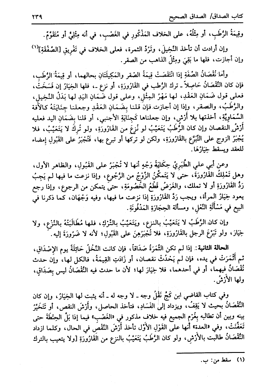 وأما نُقْصَانُ الصَّفَةِ إذا انْتَقَصَتْ قِيمَةُ الصَّقر والمَكِيلَتانِ بحالهما، أو قِيمَةُ الرُّطَبِ، فإن كان النُّقْصانُ حَاصِلاً -ترك الرُّطب في القَارُورَةِ، أو نزع-، فلها الخِيَارُ إن فَسَخَتْ، فعلى قول ضَمَانِ العَقْدِ، لها مَهْرُ المِثْلِ، وعلى قول ضَمَانِ اليَدِ لها بَدَلُ النَّخِيلِ، والرُّطَبُ, والصقر، وإذا إن أجازت فإن قلنا بِضَمَانِ العَقْدِ وجعلنا جِنايَتَهُ كالآفة السَّمَاوِيَّةِ، أخذتها بلا أرْشٍ، وإن جعلناها كَجِنايَةِ الأجنبي، أو قلنا بضَمَانِ اليد فعليه أَرْشُ النقصان وإن كان الرُّطَبُ يَتَعَيَّبُ لو نُزعَ من القَارُورَةِ، ولو تُرِك لا يَتَعَيَّبُ، فلا يُجْبَرُ الزوج على التَّبَرُّع بالقَارُورَةِ، ولكن لو تركها أو تبرع بها، فَتُجْبَرُ على القَبُولِ إِمضاء للعقد ويسقط خِيارُهَا.