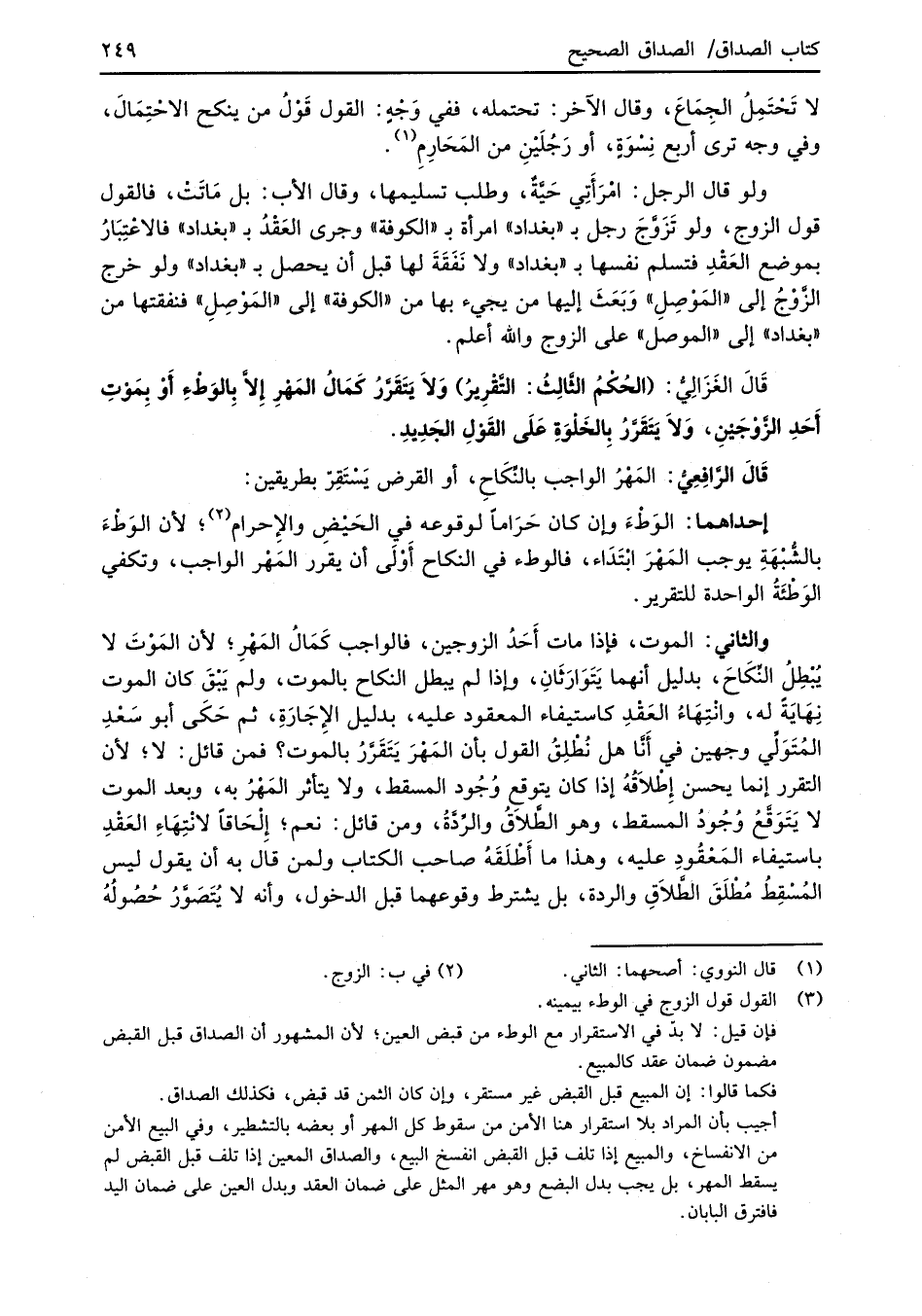قَالَ الغَزَالِيُّ: (الحُكْمُ الثَّالِثُ: التَّقْرِيرُ) وَلا يَتَقرَّرُ كَمالُ المَهْرِ إِلاَّ بِالوَطْءِ أَوْ بِمَوْتِ أَحَدِ الزَّوْجَيْنِ، وَلا يَتَقرَّرُ بِالخَلْوَةِ عَلَى القَوْلِ الجَدِيدِ.