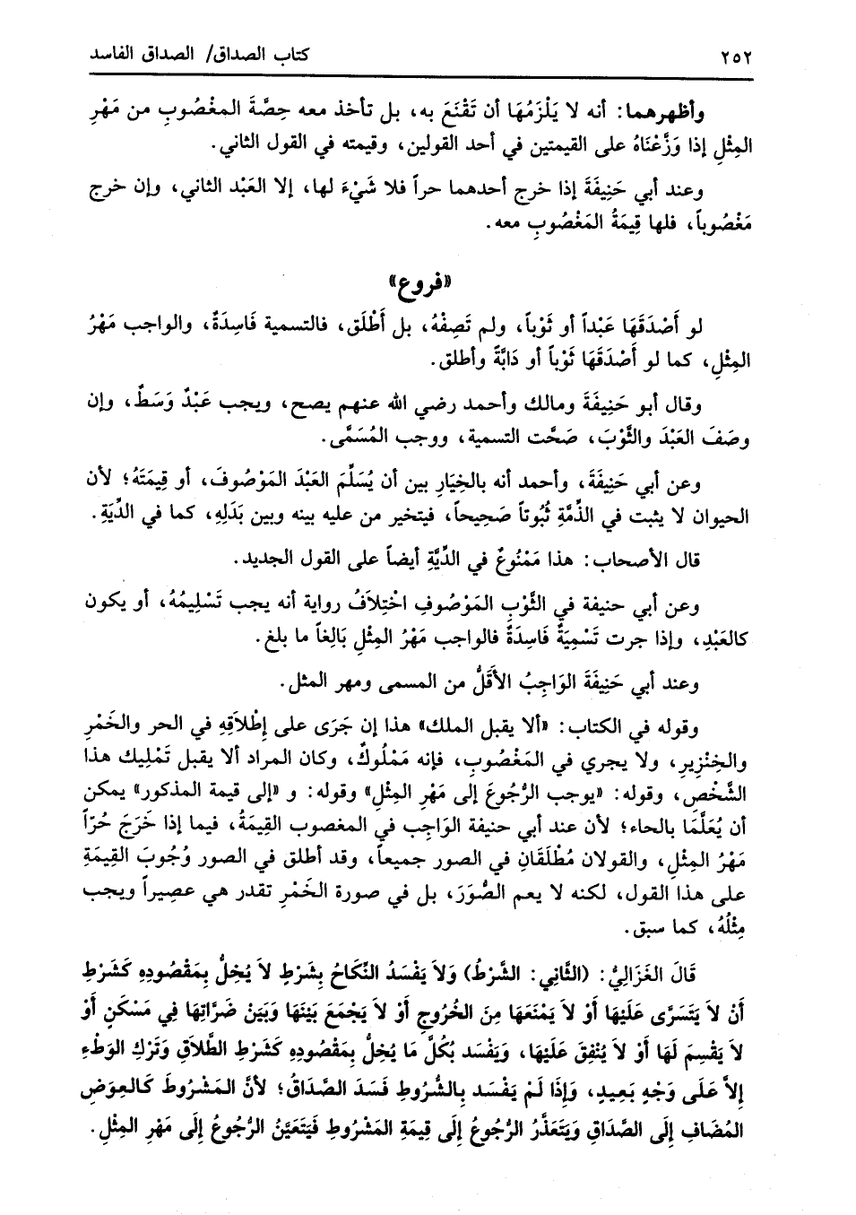 وقوله في الكتاب: "ألا يقبل الملك" هذا إن جَرَى على إِطْلاَقِهِ في الحر والخَمْرِ والخِنْزِيرِ، ولا يجري في المَغْصُوب، فإنه مَمْلُوكٌ، وكان المراد ألا يقبل تَمْلِيك هذا الشَّخْصِ، وقوله: "في وجب الرُّجُوعَ إلَى مَهْرِ المِثْلِ" وقوله: و"إلى قيمة المذكور" يمكن أن يُعَلَّمَا بالحاء؛ لأن عند أبي حنيفة الوَاجِب في المغصوب القِيمَةُ، فيما إذا خَرَجَ حُرّاً مَهْرُ المِثْلِ، والقولان مُطْلَقَانِ في الصور جميعاً، وقد أطلق في الصور وُجُوبَ القِيمَةِ على هذا القول، لكنه لا يعم الصُّوَرَ، بل في صورة الخَمْرِ تقدر هي عصِيراً ويجب مِثْلُهُ، كماسبق.