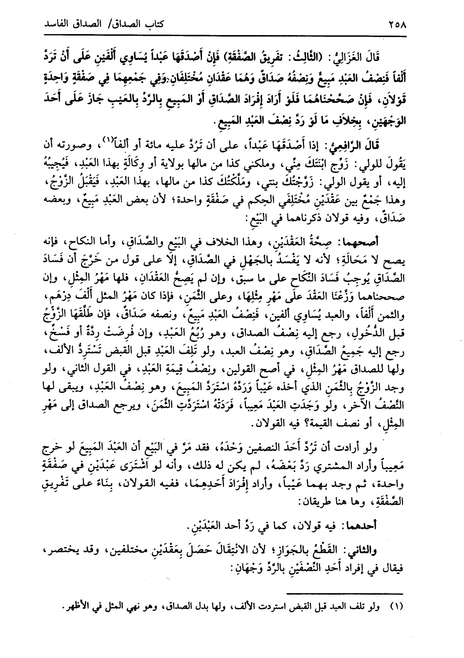قَالَ الغَزَالِيُّ: (الثَّالِثُ: تفَرِيقُ الصَّفْقَةِ) فَإنْ أَصْدَقَهَا عَبْداً يُسَاوِي أَلْفَيْنِ عَلَى أَنْ تَرَدَّ أَلْفاً فَنِصْفُ العَبْدِ مَبِيعٌّ ونصْفُهُ صَدَاقٌ وَهُمَا عَقْدَانِ مُخْتَلِفَانِ؛ وَفِي جَمْعِهِمَا فِي صَفْقَةٍ وَاحِدَةٍ قَوْلاَنِ، فَإنْ صَحَّحْنَاهُمَا فَلَوْ أَرَادَ إِفْرَادَ الصَّدَاقِ أَوْ المَبِيعِ بِالرَّدِّ بِالعَيْبِ جَازَ عَلَى أَحَدَ الوَجْهَيْنِ، بخِلاَفِ ما لَوْ رَدَّ نِصْفَ العَبْدِ المَبِيعِ.