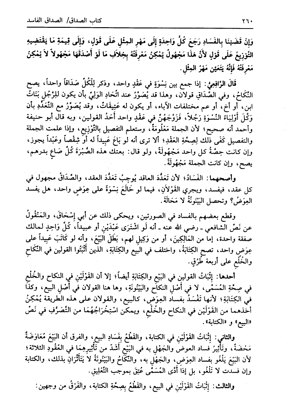 قَالَ الرَّافِعِيُّ: إذا جمع بين نِسْوَةٍ في عَقْدٍ واحد، وذكر لِلْكُلِّ صَدَاقاً واحدًا، يصح النِّكَاحُ، وفي الصَّدَاقِ قولان، وهذا قد يُصَوَّرُ عند اتِّحَادِ الوَليَّ بأن يكون للِرَّجُلِ بَنَاتُ ابن، أو أخ، أو عم مختلفات الآباء، أو يكون له عَتِيقَاتٌ، وقد يُصَوَّرُ مع التَّعَدُّدِ بأن وَكَّلَ أَوْلِيَاءُ النِّسْوَةِ رَجُلاً، فَزَوَّجَهُنَّ في عَقْدٍ واحد أَحَدُ القولين، وبه قال أبو حنيفة وأحمد أنه صحيح؛ لأن الجملة مَعْلُومَةٌ، وستعلم التفصيل بالتَّوْزِيعِ، وإذا علمت الجملة والتفصيل كَفَى ذلك لِصِحَّةِ العَقْدِ؛ ألا ترى أنه لو بَاعَ عَبِيداً له أو شِقْصاً وعَبْداً يجوز، وإن كانت حِصَّةُ كل واحد مَجْهُولَةٌ، ولو قال: بعتك هذه الصُّبْرَةَ كُلَّ صَاعٍ بدرهم، يصح، وإن كانت الجملة مَجْهُولَةً.