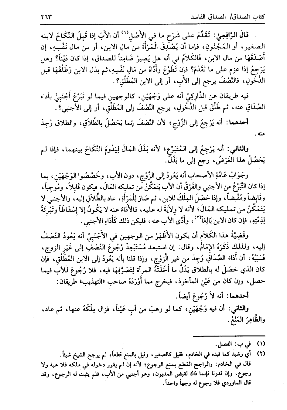 وجَوَابُ عَامَّةِ الأصحاب أنه يَعُودُ إلى الزَّوْجِ، دون الأب، وخَصَّصُوا الوَجْهَيْنِ، بما إذا كان التَّبَرُّعُ من الأجنبي والفَرْقُ أن الأب يَتَمَكَّنُ من تمليكه المَالَ، فيكون قَابِلاً، ومُوجِباً، وقابضاً ومُقْبضاً، وإذا حَصَلَ المِلْكُ للابن، ثم صارَ للْمَرْأَةِ، عاد بالطَّلاَقِ إليه، والأجنبي لا يَتَمَكَّنُ من تمليكه المَالَ؛ لأنه لا وِلاَيَةَ له عليه، فالأَدَاءُ عنه لا يَكُونُ إلا إِسْقَاطَاً وتَبْرِئَةً لِذِمَّتِهِ، فإن كان الابن بالِغاً (¬2)، وأَدَّى الأب عنه، فليكن ذلك كَأَدَاءِ الأجنبي.