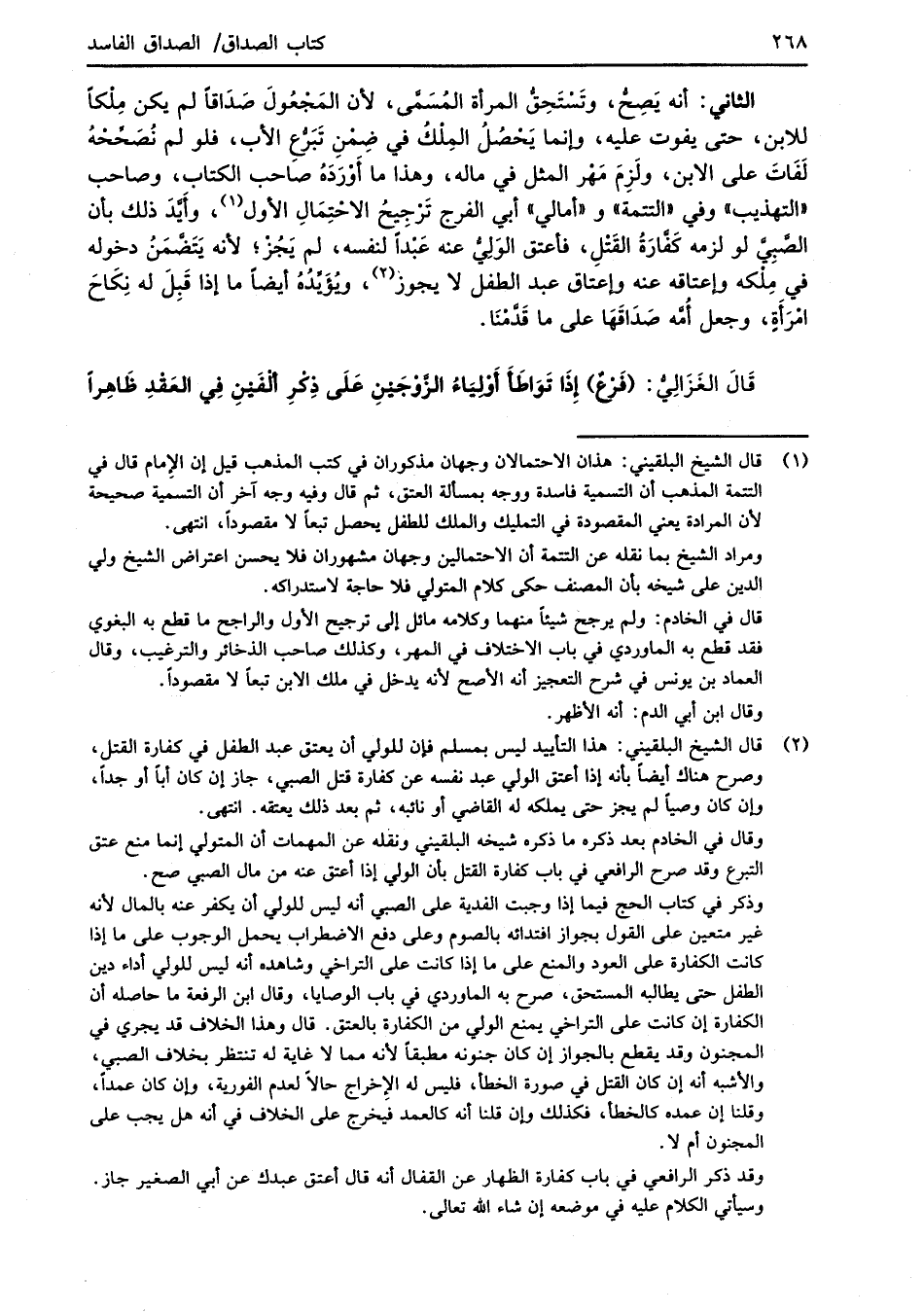 (¬2) قال الشيخ البلقيني: هذا التأييد ليس بمسلم فإن للولي أن يعتق عبد الطفل في كفارة القتل، وصرح هناك أيضاً بأنه إذا أعتق الولي عبد نفسه عن كفارة قتل الصبي، جاز إن كان أباً أو جداً، وإن كان وصيًا لم يجز حتى يملكه له القاضي أو نائبه، ثم بعد ذلك يعتقه. انتهى.