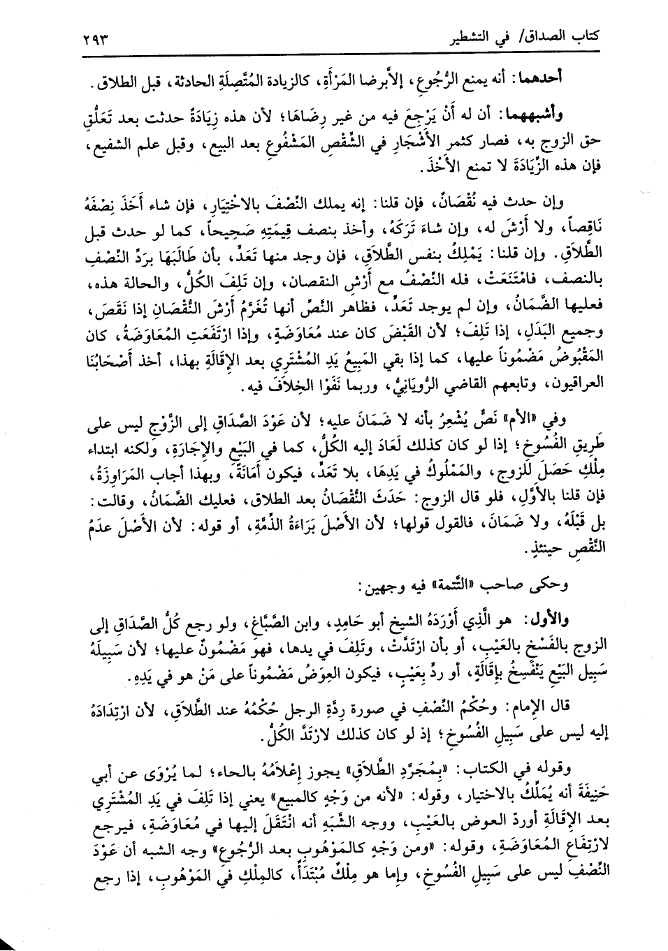 وقوله في الكتاب: "بِمُجَرِّدِ الطَّلاَقِ" يجوز إِعْلاَمُهُ بالحاء؛ لما يُرْوَى عن أبي حَنِيْفَةَ أنه يُمَلِّكُ بالاختيار، وقوله: "لأنه من وجْهٍ كالمبيع" يعني إذا تَلِفَ في يَدِ المُشْتَرِي بعد الإِقَالَةِ أوردّ الحوض بالعَيْبِ، ووجه الشَّبَهِ أنه انْتَقَلَ إليها في مُعَاوَضَةِ، فيرجع لارْتِفَاعِ المُعَاوَضَةِ، وقوله: "ومن وَجْهٍ كالمَوْهُوبِ بعد الرُّجُوعِ" وجه الشبه أن عَوْدَ النِّصْفِ ليس على سَبِيلِ الفُسُوخِ، وإِما هو مِلْكٌ مُبْتَدَأٌ، كالمِلْكِ في المَوْهُوبِ، إذا رجع