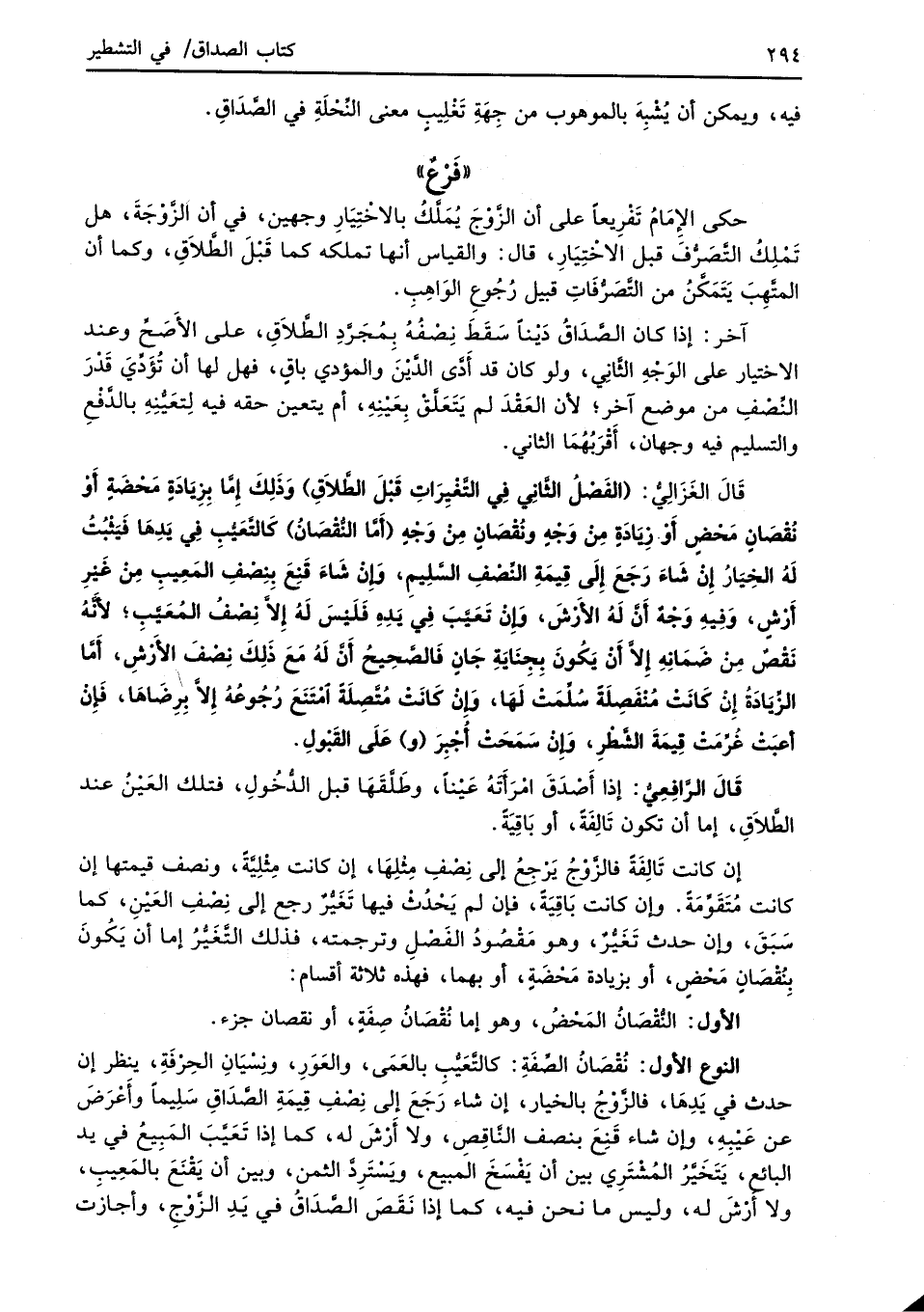 قَالَ الغَزَالِيُّ: (الفَصْلُ الثَّانِي في التَّغْيِراتِ قَبْلَ الطَّلاَقِ) وَذَلِكَ إِمَّا بِزِيادَةٍ مَحْضَةٍ أَوْ نُقْصَانٍ مَحْضٍ أَوْ زِيَادَةٍ مِنْ وَجْهٍ ونُقْصَانٍ مِنْ وَجْهٍ (أمَّا النُّقْصَانُ) كَالتَّعَيُّبِ في يَدِهَا فَيَثْبُتُ لَهُ الخِيَارُ إنْ شَاءَ رَجَعَ إِلَى قِيمَةِ النِّصْفِ السَّلِيمِ، وإنْ شَاءَ قَنِعَ بِنِصْفِ المَعِيبِ مِنْ غَيْرِ أَرْشٍ، وَفِيهِ وَجْهٌ أَنَّ لَهُ الأَرْشَ، وإنْ تَعَيَّبَ في يَدِهِ فَلَيْسَ لَهُ إِلاَّ نِصْفُ المُعَيَّبِ؛ لأَنَّهُ نَقْصٌ مِنْ ضَمَانِهِ إِلاَّ أنْ يَكُونَ بِجِنَايَةِ جَانٍ فالصَّحِيحُ أَنَّ لَهُ مَعَ ذَلِكَ نِصْفَ الأرْشِ، أمَّا الزِّيَادَةُ إِنْ كَانَتْ مُنْفَصِلَةً سُلَّمَتْ لَهَا، وَإِنْ كَانَتْ مُتَّصِلَةً امْتَنَعَ رُجُوعُهُ إِلاَّ بِرِضَاهَا، فَإِنْ أعبَتْ غُرِّمَتْ قِيمَةَ الشَّطْرِ، وَإنْ سَمَحَتْ أُجْبِرَ (و) عَلَى القَبْولِ.