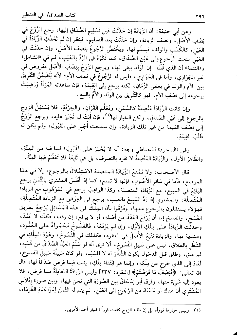 قال الأصحاب: ولا تَمْنَعُ الزِّيَادَةُ المتصلة الاسْتِقْلاَلَ بالرجوع، إلا في هذا الموضع، فأما في سَائِرِ الأُصُولِ، فإنها لا تمنع، كما إذا أَفْلَسَ المشتري بالثَّمَنِ يرجع البَائِعُ في المبيع، مع الزِّيَادَةِ المتصلة، وكذا الوَاهِبُ يرجع في المَوْهُوبِ مع الزيادة المُتَّصِلَة، والمشتري إذا ردَّ المَبِيعَ بالعيب، يرجع في العِوَضِ مع الزيادة المُتَّصِلَةِ، فهؤلاء يستقلون بالرجوع معها، وفَرَّقُوا بأن المِلْكَ في هذه المَسَائِلِ يَرْجِعُ بطريق الفَسْخ، والفسخ إما أن يَرْفَعَ العَقْدَ من أصْلِهِ، أو لا يرفع، إن رفعه، فكأنه لا عَقْدَ، وحدثَت الزِّيَادَةُ على مِلْكِ الأَوَّلِ، وإن لم يَرْفَعْهُ، فالفُسُوخُ مَحْمُولَةٌ على العُقُودِ، ومشبهة بها، والزيادة تَتْبَعُ الأصْلَ في العقود، فكذلك في الفُسُوخَ، وعَوْدُ المِلْكِ في الشَّطْرِ بالطلاق، ليس على سَبِيل الفُسُوخ، ألا ترى أنه لو سَلَّمَ العَبْدُ الصَّدَاقَ من كَسْبِهِ، ثم عتق، وطلق قبل الدخول يكون الشَّطرُ له لا للسَّيِّدِ، ولو كان سَبِيلُهُ سَبِيلَ الفسوخ، لَعادَ إلى الذي خرج عن مِلْكِهِ، وإنما هو ابْتَداءُ مِلْكٍ، يثبت فيما فرض صَداقًا لها، قال الله تعالى: {فَنِصْفُ مَا فَرَضْتُمْ} [البقرة: 237] وليس الزِّيَادَةُ الحَادِثَةُ مما فرض، فلا يعود إليه شَيْءٌ منها، وفرق أبو إسْحَاقَ بين الصُّورَةِ التي نحن فيها، وبين صورة إِفْلاَسِ المُشْتَرِي أن هناك لو مَنَعْنَاهُ من الرُّجُوعِ إلى العَيْنِ، لم يتم له الثَّمَنُ لِمُزاحَمَةِ الغُرَمَاءِ،