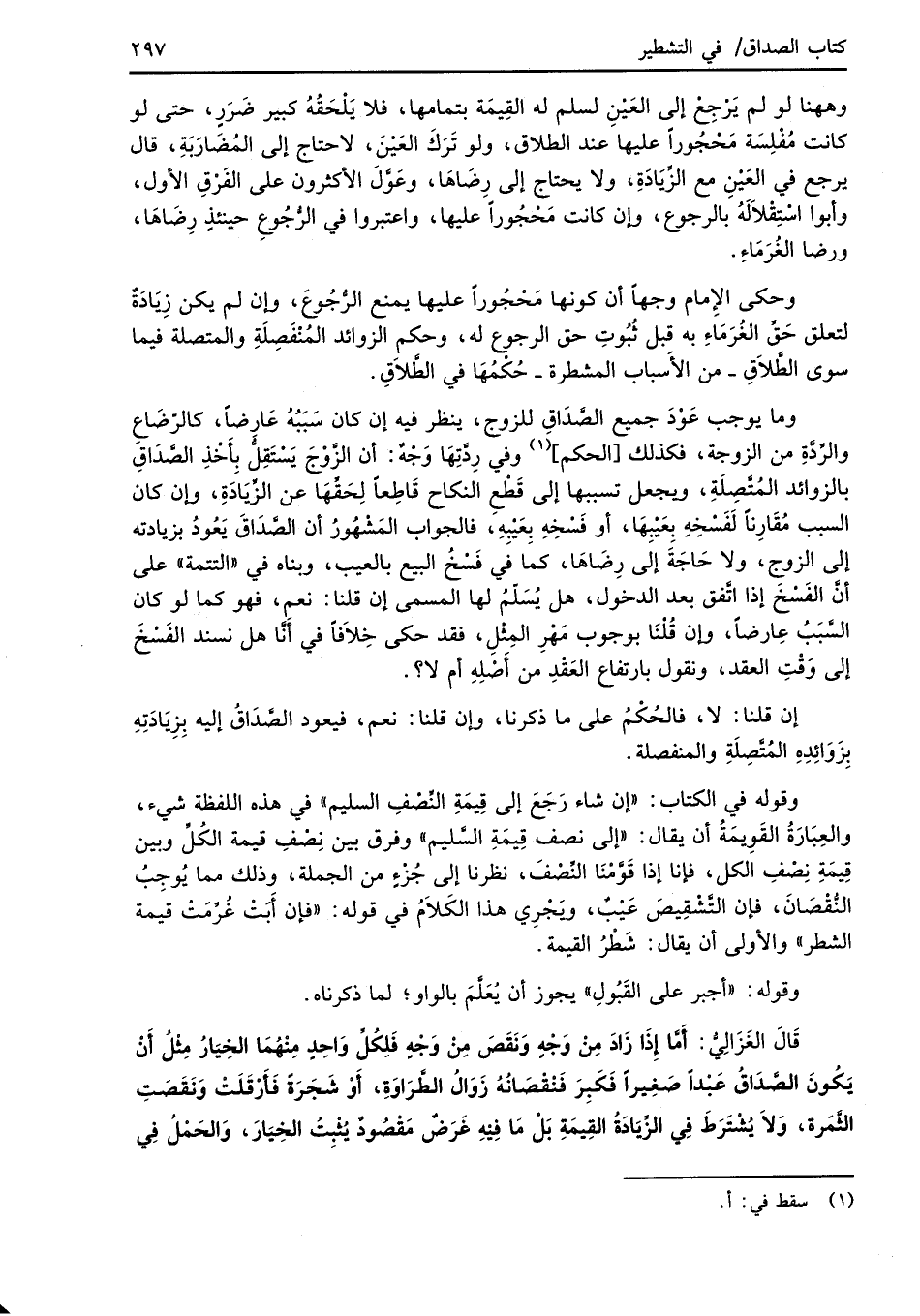 قَالَ الغَزَالِيُّ: أَمَّا إِذَا زَادَ مِنْ وَجْهٍ وَنَقَصَ مِنْ وَجْهٍ فَلِكُلِّ وَاحِدٍ مِنْهُمَا الخِيَارُ مِثْلُ أَنْ يَكُونَ الصَّدَاقُ عَبْدًا صَغِيرًا فَكَبِرَ فَنْقْصَانُهُ زَوَالُ الطَّرَاوَةِ، أَوْ شَجَرَةً فأَرْقَلَتْ وَنَقَصَتِ الثَّمَرة، وَلا يُشْتَرَطَ فِي الزِّيَادَةُ القِيمَةِ بَلْ مَا فِيْهِ غَرَضٌ مَقْصُودٌ يُثْبِتُ الخِيَارَ، وَالحَمْلُ فِي