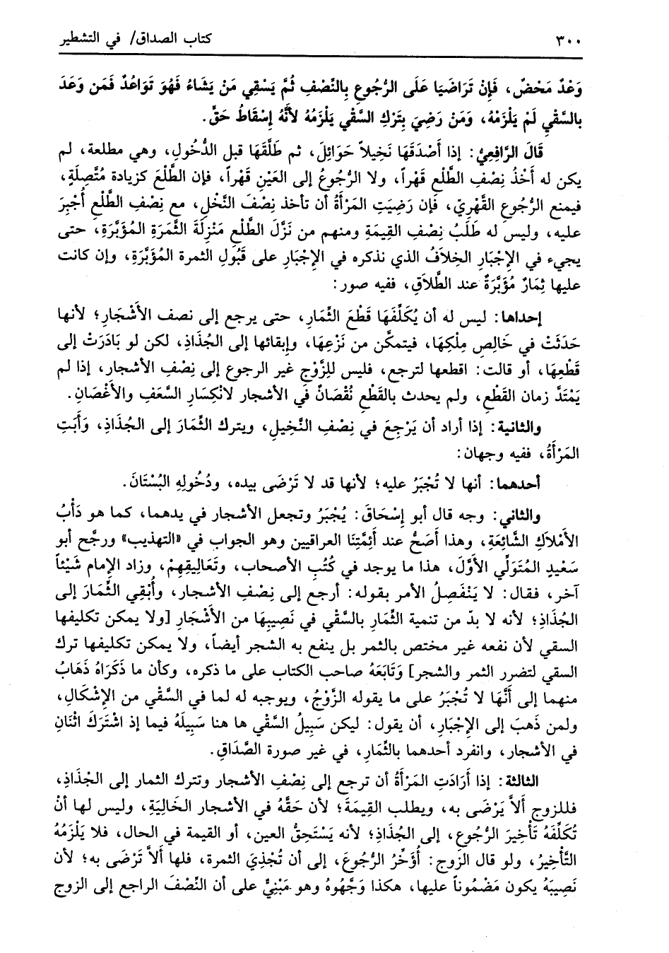 والثاني: وجه قال أبو إِسْحَاقَ: يُجْبَرُ وتجعل الأشجار في يدهما، كما هو دَأْبُ الأمْلاَكِ الشَّائِعَةِ، وهذا أَصَحُّ عند أَئِمَّتِنا العراقيين وهو الجواب في "التهذيب" ورجَّح أبو سَعْيدٍ المُتَوَلِّي الأَوَّلَ، هذا ما يوجد في كُتُب الأصحاب، وتَعَالِيقِهِمْ، وزاد الإِمام شَيْئاً آخر، فقال: لا يَنْفَصِلُ الأمر بقوله: أرجعَ إلى نِصْفِ الأشجار، وأبْقِي الثِّمَارَ إلى الجُذَاذِ؛ لأنه لا بدّ من تنمية الثِّمَارِ بالسَّقْي في نَصِيبِهَا من الأَشْجَارِ [ولا يمكن تكليفها السقي لأن نفعه غير مختص بالثمر بل ينفع به الشجر أيضًا، ولا يمكن تكليفها ترك السقي لتضرر الثمر والشجر] وَتابَعَهُ صاحب الكتاب على ما ذكره، وكان ما ذَكَرَاهُ ذَهَابُ منهما إلى أَنَّهَا لا تُجْبَرُ على ما يقوله الزَّوْجُ، ويوجبه له لما في السَّقْي من الإِشْكَالِ، ولمن ذَهبَ إلى الإجْبَارِ، أن يقول: ليكن سَبِيلُ السَّقْي هاهنا سَبِيلَهُ فيما إذ اشْتَرَكَ اثْنَانِ في الأشجار، وانفرد أحدهما بالثِّمَارِ، في غير صورة الصَّدَاقِ.