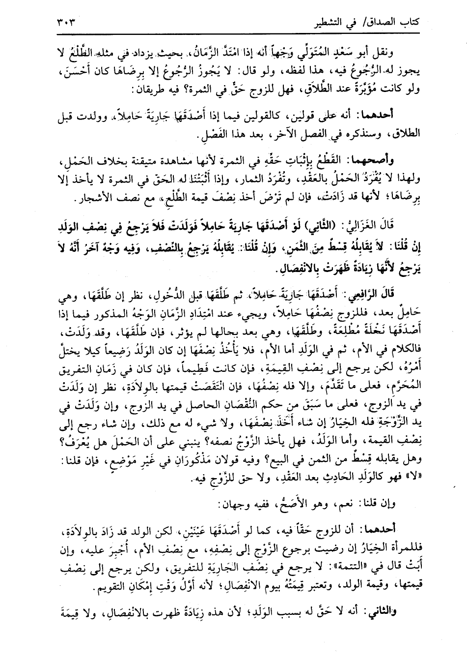 قَالَ الغَزَالِيُّ: (الثَّانِي) لَوْ أَصْدَقَهَا جَارِيَةً حَامِلاً فَوَلَدَتْ فَلا يَرْجِعُ فِي نِصْفِ الوَلَدِ إِنْ قُلْنَا: لاَ يُقَابِلُهُ قِسْطٌ مِنَ الثَّمَنِ، وَإِنْ قُلْنَا: يُقَابِلُهُ يَرْجِعُ بِالنِّصْفِ, وَفِيه وَجْهٌ آخَرُ أنَّهُ لاَ يَرْجِعُ لأَنَّهَا زِيَادَةٌ ظَهَرَتْ بِالانْفِصَالِ.