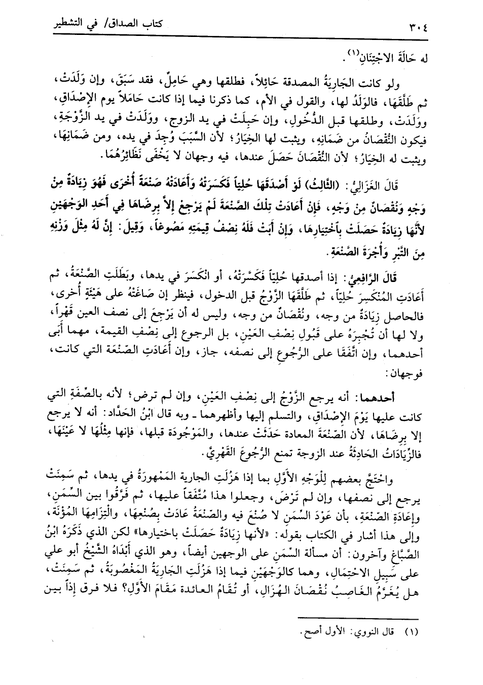 قَالَ الغَزالِيُّ: (الثَّالِثُ) لَوْ أصْدَقَهَا حُلِيّاً فَكَسَرَتْهُ وَأَعَادَتْهُ صَنْعَةً أُخْرَى فَهُوَ زَيَادَةٌ مِنْ وَجْهٍ وَنُقْصَانٌ مِنْ وَجْهٍ، فَإِنْ أَعَادَتْ تِلْكَ الصَّنْعَةَ لَمْ يَرْجِعْ إِلاَّ بِرِضَاهَا فِي أَحَدِ الوَجْهَيْنِ لأنَّهَا زِيَادَةٌ حَصَلَتْ باخْتِيَارِهَا، وَإِنْ أَبَتْ فَلَهُ نِصْفُ قِيمَتِهِ مَصُوغاً، وَقِيلَ: إِنَّ لَهُ مِثْلَ وَزْنهِ مِنَ التَّبْرِ وَأُجْرَةَ الصَّنْعَةِ.