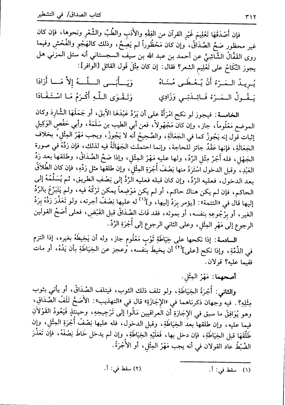 فإن أَصْدَقَهَا تَعْلِيمَ غَيْرِ القرآن من الفِقْهِ والأَدَبِ والطِّبِّ والشِّعْرِ ونحوها، فإن كان غير محظور صَحَّ الصَّدَاقُ، وإن كان مَحْظُوراً لم يَصِحَّ، وذلك كالهَجْوِ والفُحْشِ وفيما روى القَفَّال الشَّاشِيُّ عن أحمد بن عبد الله بن سيف السجستاني أنه سئل المزني هل يجوز النِّكَاحُ على تَعْلِيمِ الشعر؟ فقال: إن كان مِثْلَ قَول القائل [الوافر]: