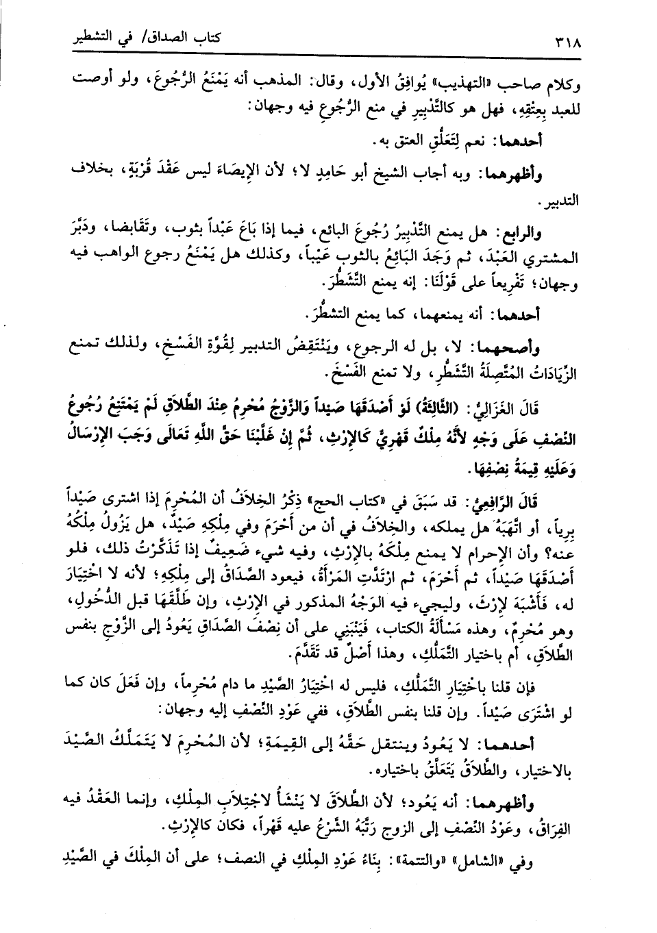 وأصحهما: لا، بل له الرجوع، ويَنْتَقِضُ التدبير لِقُوَّةِ الفَسْخِ، ولذلك تمنع الزِّيَادَاتُ المُتَّصِلَةُ التَّشَطُّرِ، ولا تمنع الفَسْخَ.