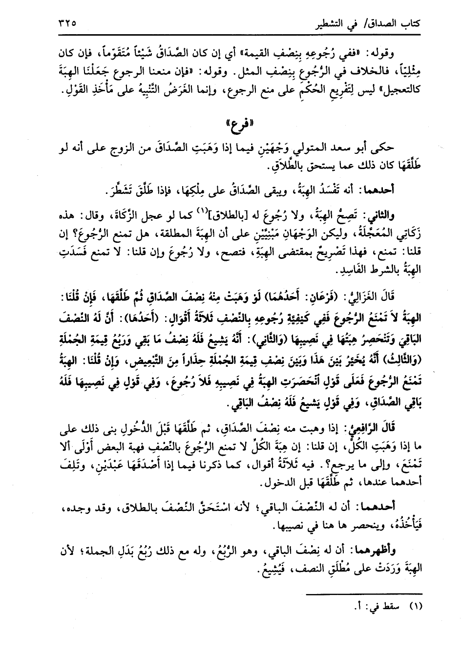 قَالَ الغَزَالِيُّ: (فَرْعَانِ: أَحَدُهُمَا) لَوْ وَهَبَتْ مِنْهُ نِصْفَ الصَّدَاقِ ثُمَّ طَلَّقَهَا، فَإنْ قُلْنَا: الهِبَةُ لاَ تَمْنَعُ الرُّجُوعَ فَفِي كَيْفِيَّةِ رُجُوعِهِ بالنِّصْفِ ثَلاَثَةُ أَقْوَالٍ: (أَحَدُهَا): أَنَّ لَهُ النِّصْفَ البَاقِيَ وَتَنْحَصِرُ هِبَتُهَا في نَصِيبِهَا (وَالثَّانِي): أَنَّهُ يَشِيعُ فَلَهُ نِصْفُ مَا بَقِي وَرَبُعُ قِيمَةِ الجُمْلَةِ (وَالثَّالِثُ) أَنَّهُ يُخَيَّرُ بَيْنَ هَذَا وَبَيْنَ نِصْفِ قِيمَةِ الجُمْلَةِ حِذَاراً مِنَ التَّبْعِيضِ، وَإِنْ قُلْنَا: الهِبَةُ تَمْنَعُ الرُّجُوعَ فَعَلَى قَوْلٍ انْحَصَرَتِ الهِبَةُ في نَصِيبِهِ فَلاَ رُجُوعَ، وَفِي قَوْلٍ في نَصِيبِهَا فَلَهُ بَاقِي الصَّدَاقِ، وَفِي قَوْلٍ يَشيعُ فَلَهُ نِصفُ البَاقِي.