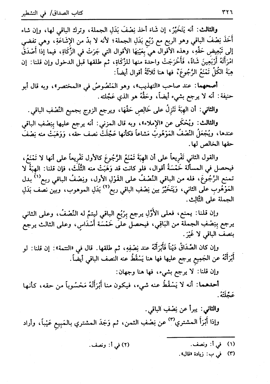 والثالث: أنه يَتَخَيَّرُ، إن شَاءَ أخذ نِصْفَ بَدَلِ الجملة، وترك الباقي لها، وإن شاء أَخَذَ نِصْفَ الباقي وهو الربع مع رُبُعِ بَدَلِ الجملة؛ لأنه لا بدّ من الإشَاعَةِ، وهي تفضي إلى تَبْعِيضِ حَقِّهِ، وهذه الأقوال هي بِعَيْنِهَا الأقوال التي جَرَتْ في الزَّكَاةِ، فيما إذا أَصْدَقَ امْرَأَتَهُ أَرْبَعِينَ شَاةً، فَأَخْرَجَتْ واحدة منها للزَّكَاةِ، ثم طلقها قبل الدخول وإن قلنا: إن هِبَةَ الكُلِّ تَمْنَعُ الرُّجُوعَ، فهاهنا ثَلاَثَةُ أقوال أيضاً: