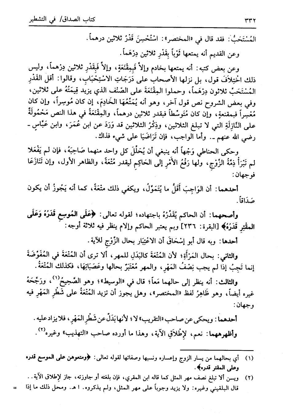 وعن بعض كتبه: أنه يمتعها بخادم وإلاَّ فَبِمِقْنَعَةٍ، وإلاَّ فَبِقَدْرِ ثلاثين دِرْهماً، وليس ذلك اخْتِلاَفَ قول، بل نزلها الأصحاب على دَرَجَاتِ الاسْتِحْبَابِ، وقالوا: أقل القَدْرِ المُسْتَحَبِّ ثلاثون دِرْهَماً، وحملوا المِقْنَعَةَ على الصّنْف الذي يزيد قِيمَتُهُ على ثلاثين، وفي بعض الشروح نص قول آخر، وهو أنه يُمَتِّعُهَا الخَادِمَ، إن كان مُوسِراً، وإن كان مُعْسِراً فبمقنعةٍ، وإن كان مُتَوسِّطاً فبقدر ثلاثين درهماً، والمِقْنَعَةُ في هذا النص مَحْمُولَةٌ على النَّازِلَةِ التي لا تبلغ الثلاثين، وذِكْرُ الثلاثين قد وَرَدَ عن ابن عُمَرَ، وابن عَبَّاسٍ -رضي الله عنهم-. وأما الواجب، فإن تَرَاضَيَا على شيء فذاك.