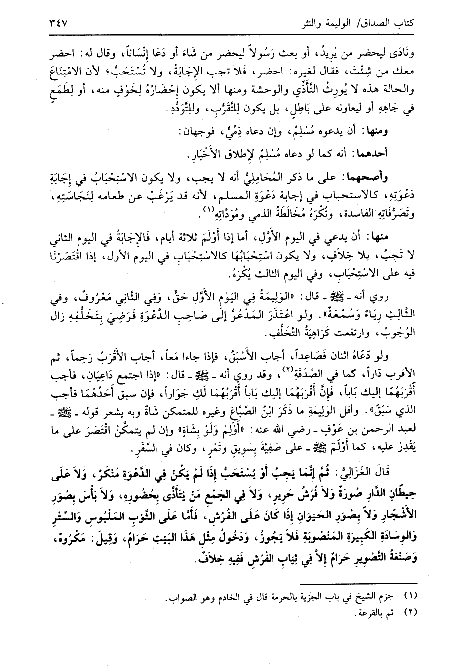 قَالَ الغَزَالِيُّ: ثُمَّ إِنَّمَا يَجِبُ أَوْ يُسْتَحَبُّ إِذَا لَمْ يَكُنْ في الدَّعْوَةِ مُنْكَرٌ، وَلاَ عَلَى حِيطَانِ الدَّارِ صُورَةٌ وَلاَ فُرُشُ حَرِيرٍ، وَلاَ فِي الجَمْعِ مَنْ يُتَأَذَّى بِحُضُورِهِ، وَلاَ بَأْسَ بِصُوَرِ الأشْجَارِ وَلاَ بِصُوَرِ الحَيَوَانِ إِذَا كَانَ عَلَى الفُرُشِ، فَأمَّا عَلَى الثَّوْبِ المَلْبُوسِ وَالسِّتْرِ وَالوِسَادَةِ الكَبِيرَةِ المَنْصُوبَة فَلاَ يَجُوزُ، وَدَخُولُ مِثْلِ هَذَا البَيْتِ حَرَامٌ، وَقِيلَ: مَكْرُوهٌ، وَصَنْعَةُ التَّصْوِيرِ حَرَامٌ إلاَّ في ثِيَاب الفُرُشِ فَفِيهِ خِلاَفٌ.