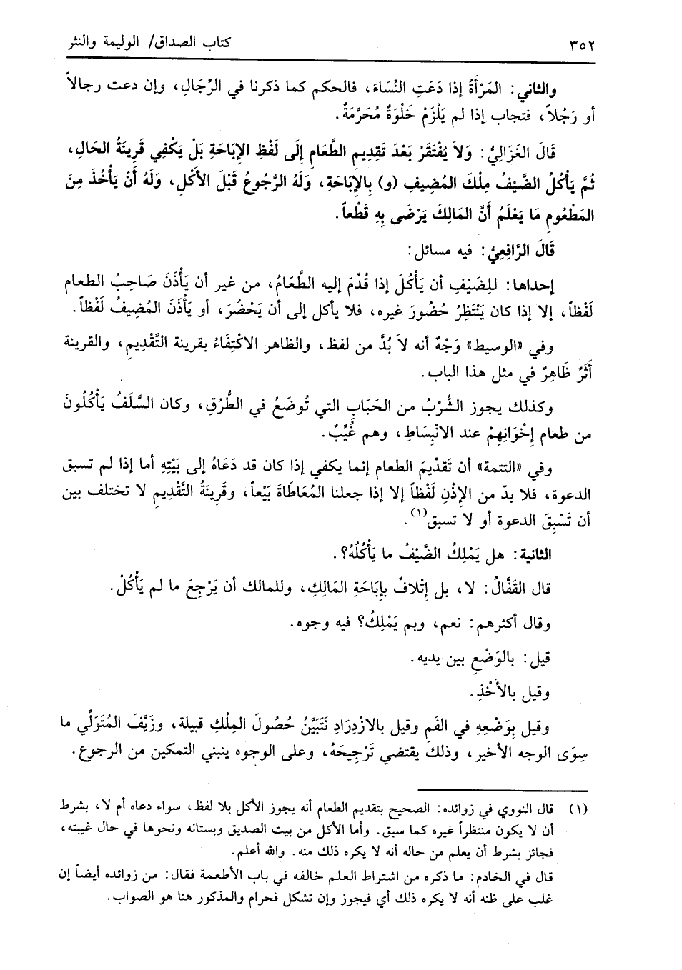 (¬1) قال النووي في زوائده: الصحيح بتقديم الطعام أنه يجوز الأكل بلا لفظ، سواء دعاه أم لا، بشرط أن لا يكون منتظراً غيره كما سبق. وأما الأكل من بيت الصديق وبستانه ونحوها في حال غيبته، فجائز بشرط أن يعلم من حاله أنه لا يكره ذلك منه. والله أعلم.