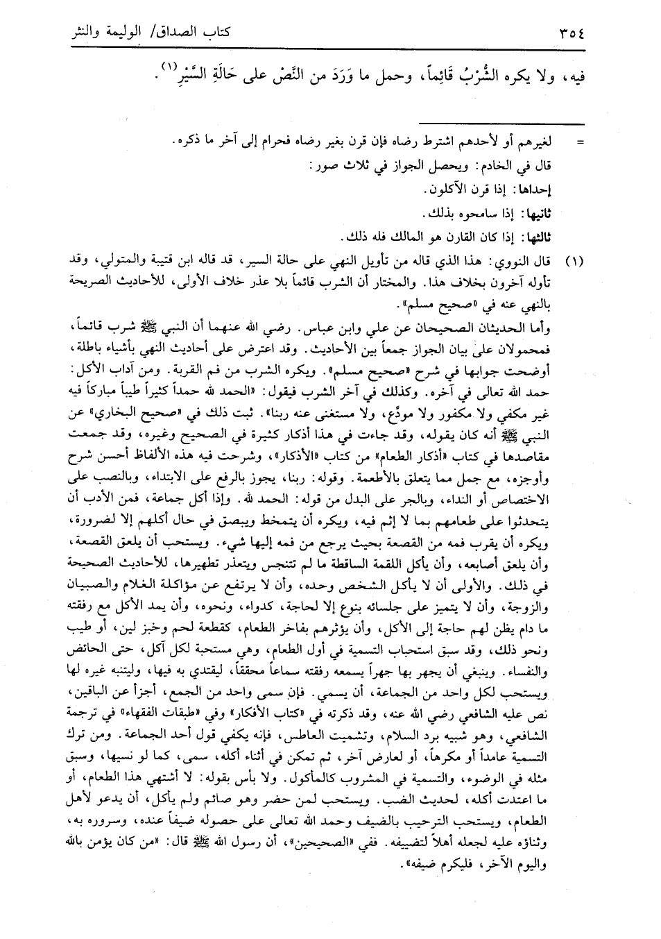 وأما الحديثان الصحيحان عن علي وابن عباس. رضي الله عنهما أن النبي -صلى الله عليه وسلم- شرب قائماً، فمحمولان على بيان الجواز جمعاً بين الأحاديث. وقد اعترض على أحاديث النهي بأشياء باطلة، أوضحت جوابها في شرح "صحيح مسلم". ويكره الشرب من فم القربة. ومن آداب الأكل: حمد الله تعالى في آخره. وكذلك في آخر الشرب فيقول: "الحمد لله حمداً كثيراً طيباً مباركاً فيه غير مكفي ولا مكفور ولا مودَّع، ولا مستغنى عنه ربنا". ثبت ذلك في "صحيح البخاري" عن النبي -صلى الله عليه وسلم- أنه كان يقوله، وقد جاءت في هذا أذكار كثيرة في الصحيح وغيره، وقد جمعت مقاصدها في كتاب "أذكار الطعام" من كتاب "الأذكار"، وشرحت فيه هذه الألفاظ أحسن شرح وأوجزه، مع جمل مما يتعلق بالأطعمة. وقوله: ربنا، يجوز بالرفع على الابتداء، وبالنصب على الاختصاص أو النداء، وبالجر على البدل من قوله: الحمد لله. وإذا أكل جماعة، فمن الأدب أن يتحدثوا على طعامهم بما لا إثم فيه، ويكره أن يتمخط ويبصق في حال أكلهم إلا لضرورة، ويكره أن يقرب فمه من القصعة بحيث يرجع من فمه إليها شيء. ويستحب أن يلعق القصعة، وأن يلعق أصابعه، وأن يأكل اللقمة الساقطة ما لم تتنجس ويتعذر تطهيرها، للأحاديث الصحيحة في ذلك. والأولى أن لا يأكل الشخص وحده، وأن لا يرتفع عن مؤاكلة الغلام والصبيان والزوجة، وأن لا يتميز على جلسائه بنوع إلا لحاجة، كدواء، ونحوه، وأن يمد الأكل مع رفقته ما دام يظن لهم حاجة إلى الأكل، وأن يؤثرهم بفاخر الطعام، كقطعة لحم وخبز لين، أو طيب ونحو ذلك، وقد سبق استحباب التسمية في أول الطعام، وهي مستحبة لكل آكل، حتى الحائض والنفساء. وينبغي أن يجهر بها جهراً يسمعه رفقته سماعاً محققاً، ليقتدي به فيها، وليتنبه غيره لها ويستحب لكل واحد من الجماعة، أن يسمي. فإن سمى واحد من الجمع، أجزأ عن الباقين، نص عليه الشَّافعي رضي الله هـ عنه، وقد ذكرته في "كتاب الأفكار" وفي "طبقات الفقهاء" في ترجمة الشَّافعي، وهو شبيه برد السلام، وتشميت العاطس، فإنه يكفي قول أحد الجماعة. ومن ترك التسمية عامداً أو مكرهاً، أو لعارض آخر، ثبم تمكن في أثناء أكله، سمى، كما لو نسيها، وسبق مثله في الوضوء، والتسمية في المشروب كالمأكول. ولا بأس بقوله: لا أشتهي هذا الطعام، أو ما اعتدت أكله، لحديث الضب. ويستحب لمن حضر وهو صائم ولم يأكل، أن يدعو لأهل الطعام، ويستحب الترحيب بالضيف وحمد الله تعالى على حصوله ضيفاً عنده، وسروره به، وثناؤه عليه لجعله أهلاً لتضييفه. ففي "الصحيحين"، أن رسول الله -صلى الله عليه وسلم- قال: "من كان يؤمن بالله واليوم الآخر، فليكرم ضيفه".