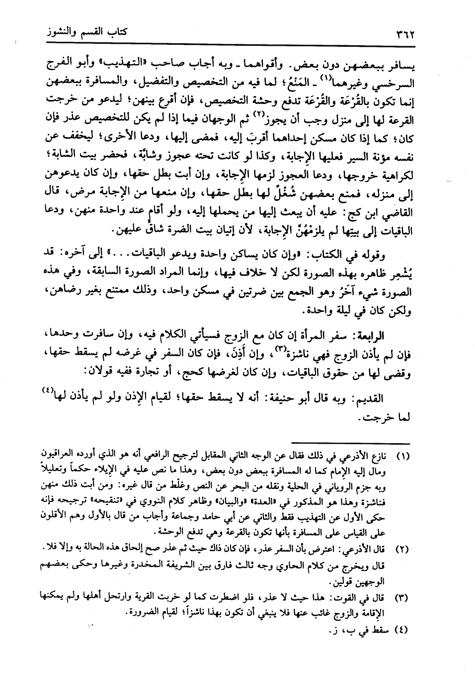 (¬1) نازع الأذرعي في ذلك فقال عن الوجه الثاني المقابل لترجيح الرافعي أنه هو الذي أورده العراقيون ومال إليه الإِمام كلما له المسافرة ببعض دون بعض، وهذا ما نص عليه في الإِيلاء حكماً وتعليلاً وبه جزم الروياني في الحلية ونقله من البحر عن النص وغلّط من قال غيره: ومن أبت ذلك منهن فناشزة وهذا هو المذكور في "العدة" "والبيان" وظاهر كلام النووي في "تنقيحه" ترجيحه فإنه حكى الأول عن التهذيب فقط والثاني عن أبي حامد وجماعة وأجاب من قال بالأول وهم الأقلون على القياس على المسافرة بأنها تكون بالقرعة وهي تدفع الوحشة.