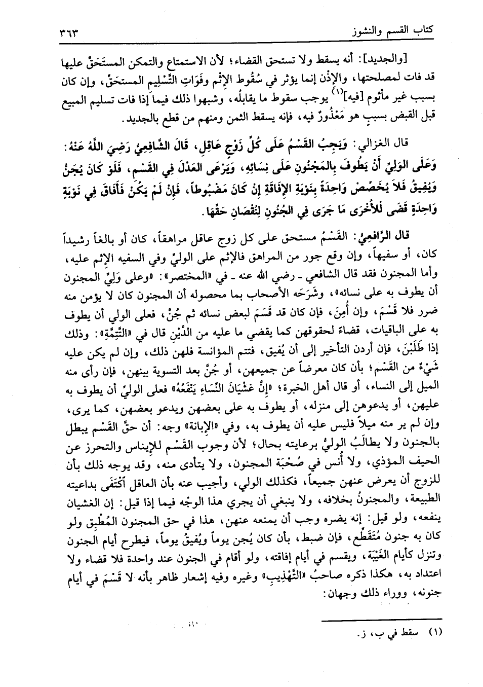 قال الغزالي: وَيَجِبُ القَسْمُ عَلَى كُلِّ زَوْجٍ عَاقِلِ، قَالَ الشَّافِعِيُّ رَضِيَ اللهُ عَنْهُ: وَعَلَى الوَلِيِّ أن يَطُوفَ بِالمَجْنُونِ عَلَى نِسَائِهِ، وَيرْعَى العَدْلَ فِي القَسْمِ، فَلَوْ كَانَ يُجَنُّ وَيُفِيقُ فَلاَ يُخَصِّصْ وَاحِدَةً بِنَوْبَةِ الإِفَاقَةِ إنْ كَانَ مَضْبُوطاً، فَإِنْ لَمْ يَكن فَأَفَاقَ فِي نَوْبَةٍ وَاحِدَةٍ قَضَى لْلأُخْرَى مَا جَرَى في الجُنُونِ لِنُقْصَانِ حَقِّهَا.