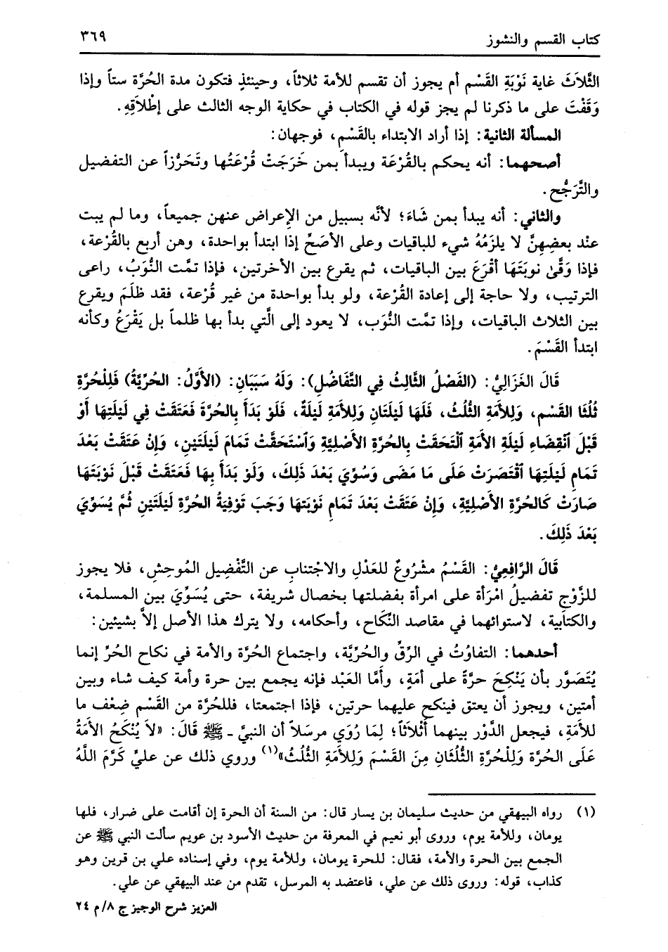 قَالَ الغَزَالِيُّ: (الفَصْلُ الثَّالِثُ في التَّفَاضُلِ): وَلَهُ سَبَبَانِ: (الأَوَّلُ: الحُرِّيَّةُ) فَلِلْحُرَّةِ ثُلُثَا القَسْم، وَلِلأَمَةِ الثُّلُثُ، فَلَهَا لَيْلَتَانِ وَلِلأَمَةِ لَيْلَةُ، فَلَوْ بَدَأَ بِالحُرَّةَ فَعَتَقَتْ في لَيْلَتِهَا أَوْ قَبْلَ انْقِضَاءِ لَيْلَةِ الأَمَةِ التَحَقَتْ بِالحُرَّةِ الأَصْلِيَّةِ وَاسْتَحَقَّتْ تَمَامَ لَيْلَتَينِ، وَإِنْ عَتَقَتْ بَعْدَ تَمَامِ لَيْلَتِهَا اقْتَصَرَتْ عَلَى مَا مَضَى وَسُوِّيَ بَعْدَ ذَلِكَ، وَلَوْ بَدَأَ بِهَا فَعَتَقَتْ قَبْلَ نَوْبَتهَا صَارَتْ كَالحُرَّةِ الأَصْلِيَّةِ، وَإِنْ عَتَقَتْ بَعْدَ تَمَامِ نَوْبَتهَا وَجَبَ تَوْفِيَةُ الحُرَّةِ لَيْلَتَينِ ثُمَّ يُسَوِّيَ بَعدَ ذَلِكَ.