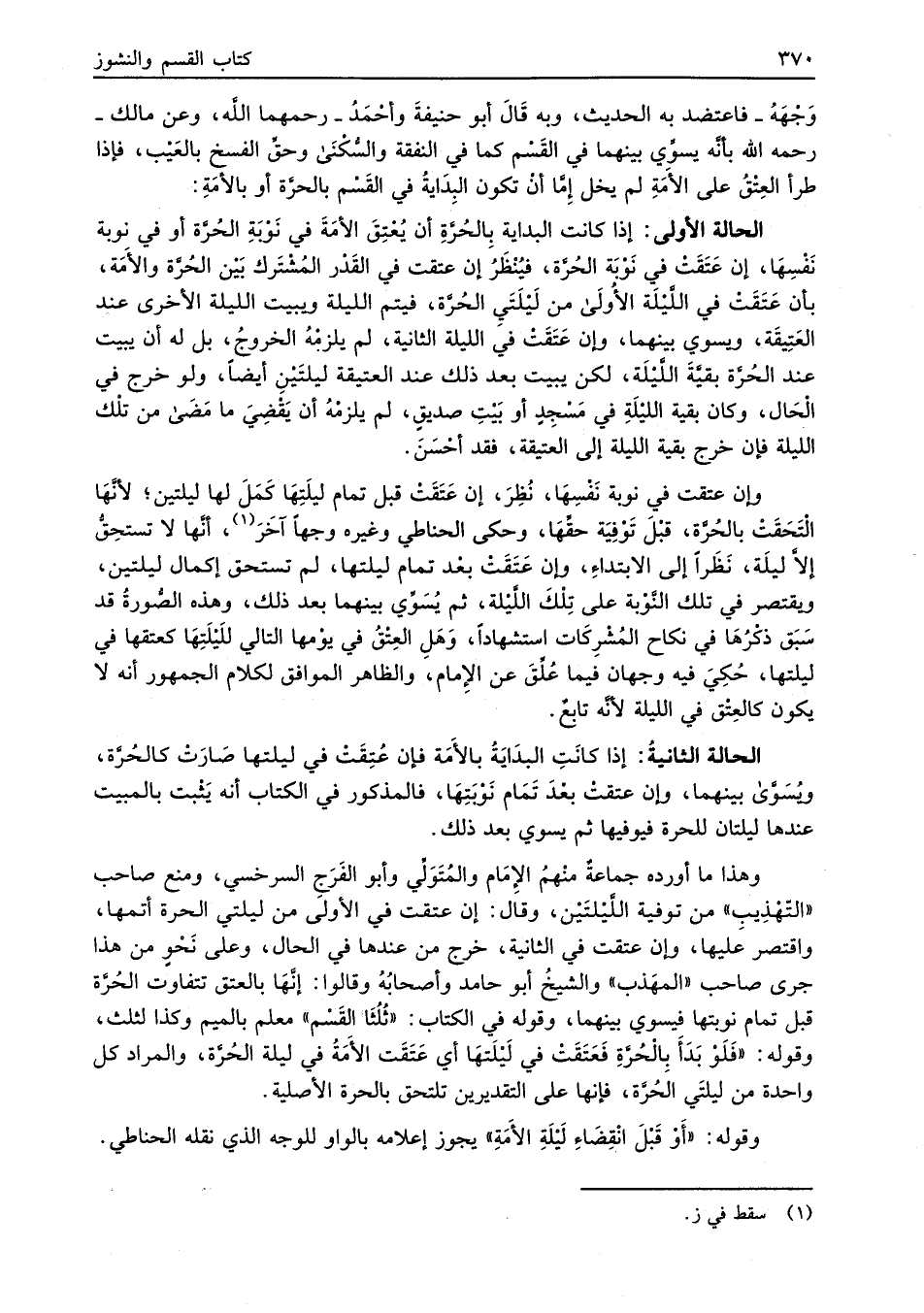 الحالة الثانية: إذا كانَتِ البدَايَةُ بالأَمَة فإن عُتِقَتْ في ليلتها صَارَتْ كالحُرَّة، ويُسَوَّى بينهما، وإن عتقت بعْدَ تَمَام نَوْبَتِهَا، فالمذكور في الكتاب أنه يَثْبت بالمبيت عندها ليلتان للحرة فيوفيها ثم يسوي بعد ذلك.