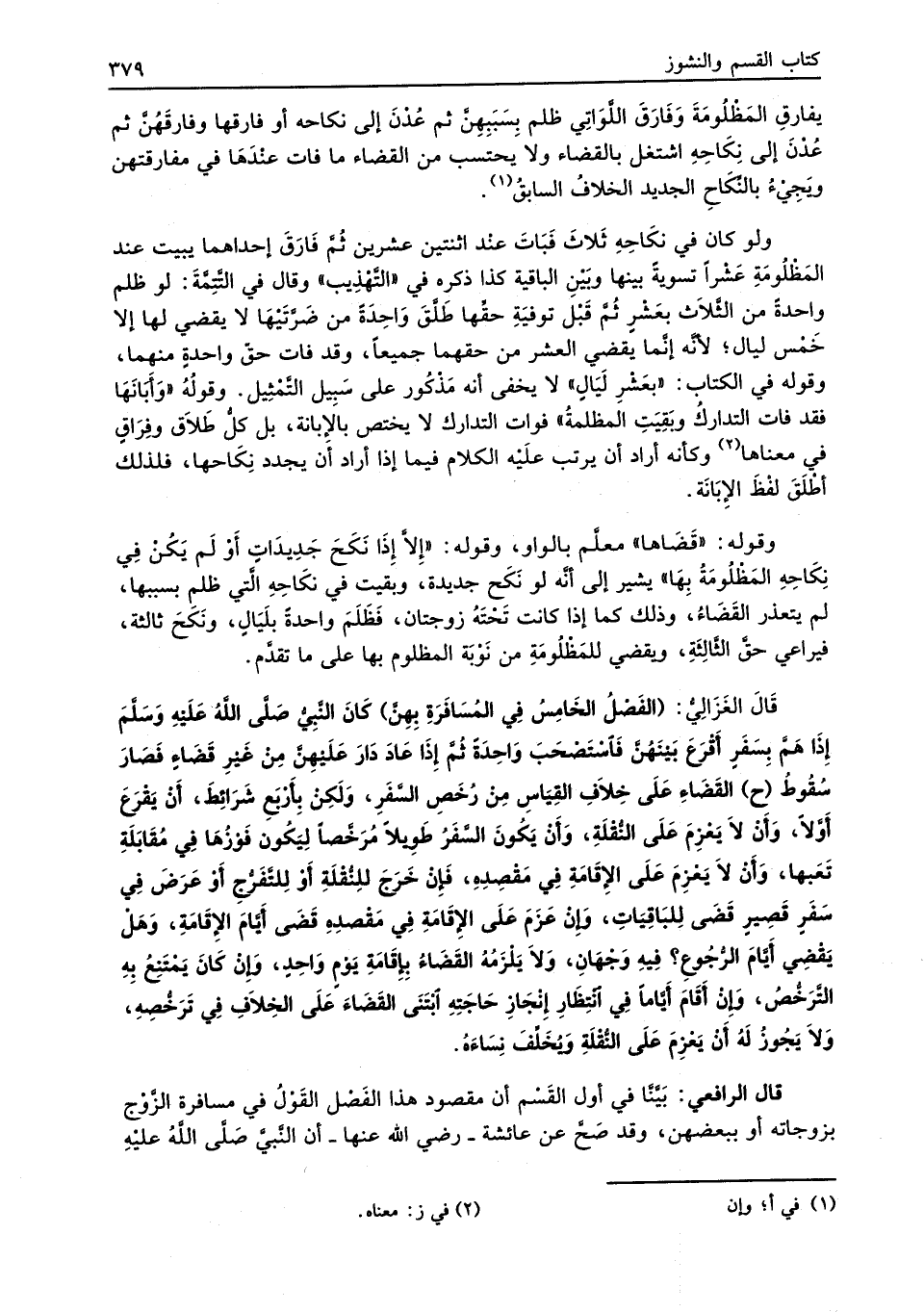 قَالَ الغَزَالِيُّ: (الفَصْلُ الخَامِسُ في المُسَافَرَةِ بِهِنَّ) كَانَ النَّبِيُّ صَلَّى اللهُ عَلَيْهِ وَسَلَّمَ إِذَا هَمَّ بِسَفَرٍ أَقْرَعَ بَيْنَهُنَّ فَاسْتَصْحَبَ وَاحِدَةً ثُمَّ إِذَا عَادَ دَارَ عَلَيْهِنَّ مِنْ غَيْرِ قَضَاءٍ فَصَارَ سُقُوطُ (ح) القَضَاءِ عَلَى خِلاَفِ القِيَاسِ مِنْ رُخَصِ السَّفَرِ، وَلَكِنْ بأَرْبَعِ شَرَائِطَ، أنْ يَقْرَعَ أَوَّلاً، وَأَنْ لاَ يَعْزِمَ عَلَى النُّقْلَةِ، وَأَنْ يَكُونَ السَّفَرُ طَوِيلاً مُرَخَّصاً لِيَكُون فَوْزُهَا في مُقَابَلَةِ تَعَبها، وَأَنْ لاَ يَعْزِمَ عَلَى الإقَامَةِ في مَقْصِدِهِ، فَإِنْ خَرَجَ للِنُّقْلَةِ أَوْ لِلتَّفَرُّجِ أَوْ عَرَضَ فِي سَفَرٍ قَصِيرٍ قَضَى لِلبَاقِيَاتِ، وَإِنْ عَزَمَ عَلَى الإِقَامَةِ في مَقْصدِهِ قَضَى أَيَّامَ الإِقَامَةِ، وَهَلْ يَقْضِي أَيَّامَ الرُّجُوعِ؟ فِيهِ وَجْهَانِ، وَلاَ يَلْزَمُهُ القَضَاءُ بِإقَامَةِ يَوْمٍ وَاحِدٍ، وَإنْ كَانَ يَمْتَنِعُ بِهِ التَّرَخُّصُ، وَإِنْ أَقَامَ أَيَّاماً في انْتِظَارِ إِنْجَازِ حَاجَتِهِ ابْتَنَى القَضَاءَ عَلَى الخِلاَفِ في تَرَخُّصِهِ، وَلاَ يَجُوزُ لَهُ أنْ يَعْزِمَ عَلَى النُّقْلَةِ وَيُخَلِّفَ نِسَاءَهُ.