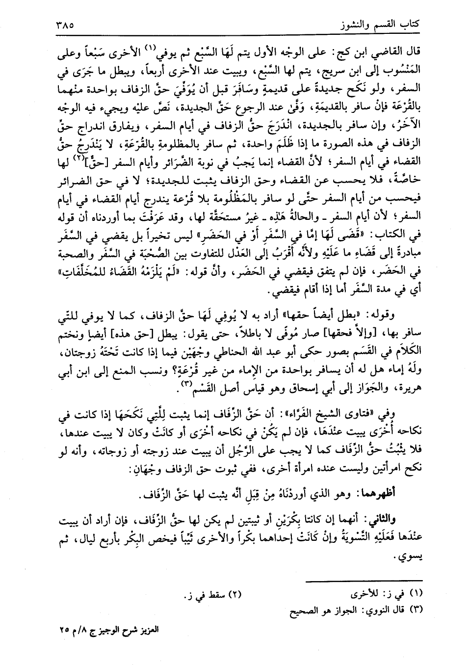 وقوله: "بطل أيضاً حقها" أراد به لا يُوفِي لَهَا حقَّ الزفاف، كما لا يوفي للتّي سافر بها، [وإلاَّ فحقها] صار مُوفَى لا باطلاً، حتى يقول: يبطل [حق هذه] أيضا ونختم الكَلاَم في القَسَم بصور حكى أبو عبد الله الحناطي وجْهَيْن فيما إذا كانت تَحْتَهُ زوجتان، ولَهُ إماء هل له أن يسافر بواحدة من الإِماء من غير قُرْعَةٍ؟ ونسب المنع إلى ابن أبي هريرة، والجَوَاز إلى أبي إسحاق وهو قياس أصل القَسْم (¬3).