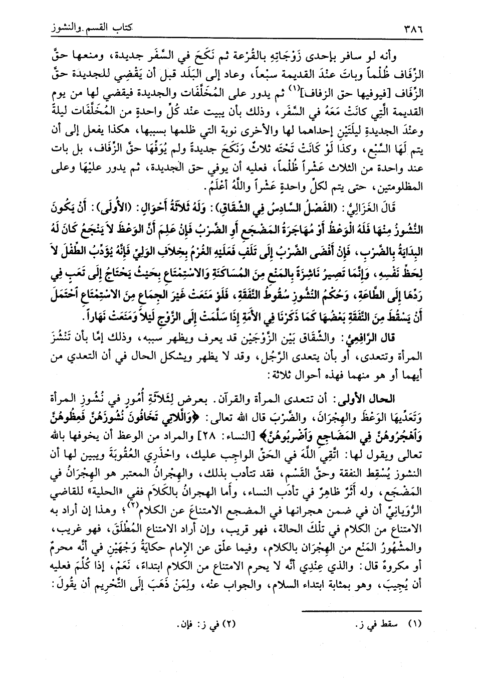 قَالَ الغَزَالِيُّ: (الفَصْلُ السَّادِسُ في الشِّقَاقِ): وَلَهُ ثَلاَثةُ أَحْوَالٍ: (الأُولَى): أَنْ يَكُونَ النُّشُوزُ مِنْهَا فَلَهُ الْوَعْظُ أَوْ مُهَاجَرَةُ المَضْجَعِ أَوِ الضَّرْبُ فَإِنْ عَلِمَ أَنَّ الوَعْظَ لاَ يَنْجَعُ كَانَ لَهُ البِدَايَةُ بِالضَّرْبِ، فَإِنْ أَفْضَى الضَّرْبُ إِلَى تَلَفٍ فَعَلَيْهِ الغُرْمُ بِخِلاَفِ الوَلِيِّ فإِنَّهُ يُؤَدِّبُ الطِّفْلَ لاَ لِحَظِّ نَفْسِهِ، وَإِنَّمَا تَصِيرُ نَاشِزَةً بِالمَنْعِ مِنَ المُسَاكَنَةِ وَالاسْتِمْتَاعِ بِحَيْثُ يَحْتَاجُ إِلَى تَعَبٍ في رَدِّهَا إِلَى الطَّاعَةِ، وَحُكْمُ النُشُّوزِ سُقُوطُ النَّفَقَةِ، فَلَوْ مَنَعَتْ غَيْرَ الجِمَاع مِنَ الاسْتِمتَاعِ احْتَمَلَ أَنْ يَسْقُطَ مِنَ النَّفَقَةِ بَعْضُهَا كَمَا ذَكَرْنَا فِي الأَمَةِ إِذَا سَلَّمَتْ إِلَى الزَّوْجِ لَيْلاً وَمَنَعَتْ نَهَاراً.