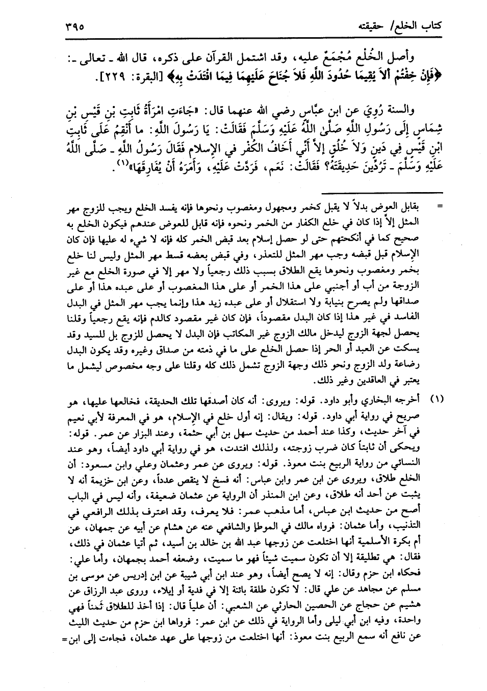 والسنة رُوِيَ عن ابن عبَّاسٍ رضي الله عنهما قال: "جَاءَتِ امْرَأَةُ ثَابِتِ بْنِ قَيْسِ بْنِ شِمَاسٍ إِلَى رَسُولِ اللَّهِ صَلَّى اللَّهُ عَلَيْهِ وَسَلَّمَ فَقَالَتْ: يَا رَسُولَ اللَّهِ: ما أَنْقِمُ عَلَى ثَابِتِ ابْنِ قَيْسٍ فِي دَينٍ وَلاَ خُلُقٍ إلاَّ أَنِّي أَخَافُ الكُفْر في الإِسلام فَقَالَ رَسُولُ اللَّهِ -صلَّى اللَّهُ عَلَيْهِ وَسَلَّمَ- تَرُدِّينَ حَدِيقَتَهُ؟ فَقَالَتْ: نَعَم، فَرَدَّتْ عَلَيْهِ، وَأَمَرَهُ أَنْ يُفَارِقَهَا" (¬1).