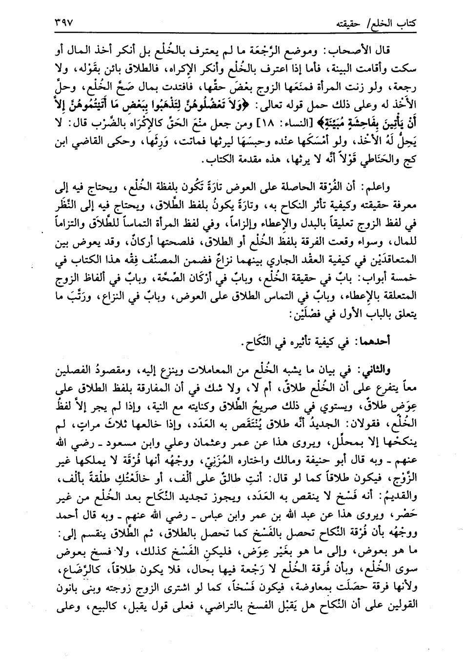 والثاني: في بيان ما يشبه الخُلْع من المعاملات وينزع إليه، ومقصودُ الفصلين معاً يتفرع على أن الخُلْع طلاقٌ، أم لا, ولا شك في أن المفارقة بلفظ الطلاق على عِوَضٍ طلاقٌ، ويستوي في ذلك صريحُ الطَّلاق وكنايته مع النية، وإذا لم يجر إلاَّ لفظُ الخُلْع، فقولان: الجديدُ أنَّه طلاق يُنْتَقَص به العَدَد، وإذا خالعها ثلاثَ مراتٍ، لم ينكحْها إلا بمحلِّل، ويروى هذا عن عمر وعثمان وعلي وابن مسعود -رضي الله عنهم- وبه قال أبو حنيفة ومالك واختاره المُزَنِيّ، ووجْهُه أنها فُرْقَة لا يملكها غير الزَّوْج، فيكون طلاقاً كما لو قال: أنتِ طالقٌ على ألْف، أو خالَعْتُكِ طلْقةً بألْف، والقديمُ: أنه فَسْخ لا ينقص به العَدَد، ويجوز تجديد النِّكَاح بعد الخُلْع من غير حَصْر، ويروى هذا عن عبد الله بن عمر وابن عباس -رضي الله عنهم- وبه قال أحمد ووجْهُه بأن فُرْقة النِّكاح تحصل بالفَسْخ كما تحصل بالطلاق، ثم الطلاق ينقسم إلى: ما هو بعوض، وإلى ما هو بغَيْر عِوَض، فليكنِ الفَسْخ كذلك، ولا فسخ بعوض سوى الخُلْع، وبأن فُرقة الخُلْع لا رَجْعة فيها بحال، فلا يكون طلاقاً، كالرَّضَاع، ولأنها فرقة حصَلَت بمعاوضة، فيكون فَسْخاً، كما لو اشترى الزوج زوجته وبنى بانون القولين على أن النِّكاح هل يَقبْل الفسخ بالتراضي، فعلى قول يقبل، كالبيع، وعلى
