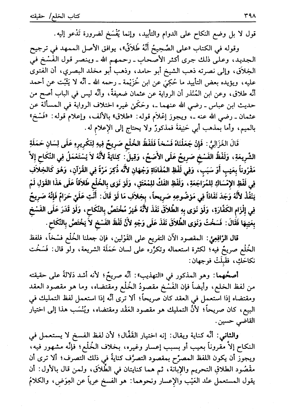 وقوله في الكتاب "على الصَّحِيحُ أَنَّهُ طَلاَقٌ"، يوافق الأصل الممهد في ترجيح الجديد، وعلى ذلك جرى أكثر الأصحاب -رحمهم الله- وينصر قول الفَسْخ في الخِلاَق، وإلى نصرته ذهب الشيخ أبو حامد، وذهب أبو مخلد البصري، أن الفتوى عليه، ويؤيده بعض التأييد ما حُكِيَ عن ابن خُزَيْمة -رحمه الله- أنَّه لا يَثْبُت عن أحمد أنَّه طلاق، وعن ابن المُنْذر أن الرواية عن عثمان ضعيفةٌ، وأنَّه ليس في الباب أصح من حديث ابن عباس -رضي الله عنهما-، وحَكَى غيره اختلاف الرواية في المسألة عن عثمان -رضي الله عنه-، ويجوز إعْلاَم قوله: "طلاق" بالألف، وإعلام قوله: "فَسْخ" بالميم، وأما بمذهب أبي حَنِيفةَ فمذكورٌ ولا يحتاج إلى الإِعلامِ له.