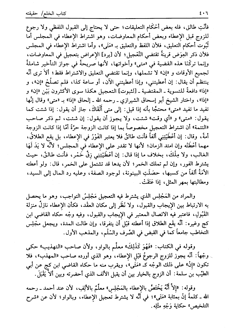 للزوج قبل الإِعطاء وبعض أحكام المعاوضات، وهو اشتراط الإِعطاء في المجلس أما ثُبُوت أحكام التعليق، فلأن اللفظ والتعليق بـ"مَتَى"، وأما اشتراط الإِعطاء في المجلس فلأن ذكر العِوَض قرينةٌ تقتضي التَّعْجيل؛ لأن [يرد] الإِعراض بتعجيل في المعاوضات، وإنما تركْنَا هذه القضية في "متى" وأخواتها, لأنها صريحةٌ في جواز التأخير شاملةٌ لجميع الأوقات و"إن" لا تشملها، وإنما تقتضي التعليق والاشتراط فقط؛ ألاَ ترى أنَّه ينتظم أن يقال: إن أعطيتني، وإذا أعطيتني الآن، أو ساعة كذا، فلم تصلُحْ "إن"، و"إذا" دافعةً للتسوية -المقتضية-[لثبوت] التعجيل هكذا سوى الأكثرون بَيْن "إن" و "إذا"، واختار الشيخ أبو إسحاق الشيرازي -رحمه الله- إلحاق "إذا" بـ"متى" وقال إنَّها تفيد ما تفيد "متى" محتجَّا بأنه إذا قيل: إلى متى أَلْقَاكَ، جاز أن يقول: إذا شئت كما يقول: "متى" و"أي وقت" شئت، ولا يجوز أن يقول: إن شئت، ثم ذكر صاحب "التتمة" أن اشتراط التعجيل مخصوصاً بما إذا كانت الزوجة حرَّةً أمَّا إذا كانت الزوجة أمةً، وقال: إن أعْطَيْتِنِي ألفاً فأنت طالقٌ فلا يعتبر الفَوْرُ في الإِعطاء، بل يقع الطلاقُ، مهما أعْطَتْه وإن امتد الزمان؛ لأنها لا تقدر على الإِعطاء في المجلس؛ لأنَّه لا يَدَ لَهَا الغالب، ولا مِلْكَ، بخلاف ما إذا قال: إن أعْطَيْتِنِي زِقَّ خَمْر، فأنت طالقٌ، حيث يشترط الفور، وإن لم تملك الخمر؛ لأن يدها قد تشتمل على الخمر، قال: ولو أعطته الأمَةُ ألفاً من كسبها، حصَلَتِ البينونة، لوجود الصفة، وعليه رد المال إلى السيد، ومطالبتها بمهر المثل، إذا عَتَقَتْ.