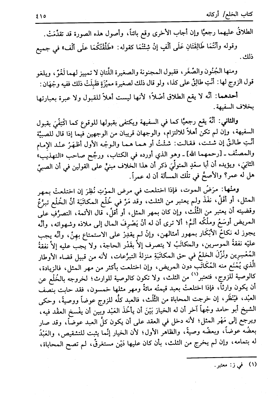 والثاني: أنَّه يقع رجعيّاً كما في السفيهة ويكتفى بقبولها للوقوع كما اكْتِفُيَ بقبول السفيهة، وإن لم تكن أهلاً للالتزام، والوجهان قريبان من الوجهين فيما إذا قال للصبيَّة أنْتِ طالقٌ إن شئت، فقالت: شئْتُ أو هما هما والوجْه الأول أظهَرُ عنْد الإِمام والمصنِّف -[رحمهما الله]- وهو الذي أورده في الكتاب، ورجَّح صاحب "التهذيب" الثانِيَ، ويؤيده أن أبا سعْدٍ المتولِّيَ ذكر أن هذا الخلاف مبنيٌّ على القولين في أن الصبيَّ هل له عمر؟ والأصحُّ في تلْك المسألة أن له عمراً.