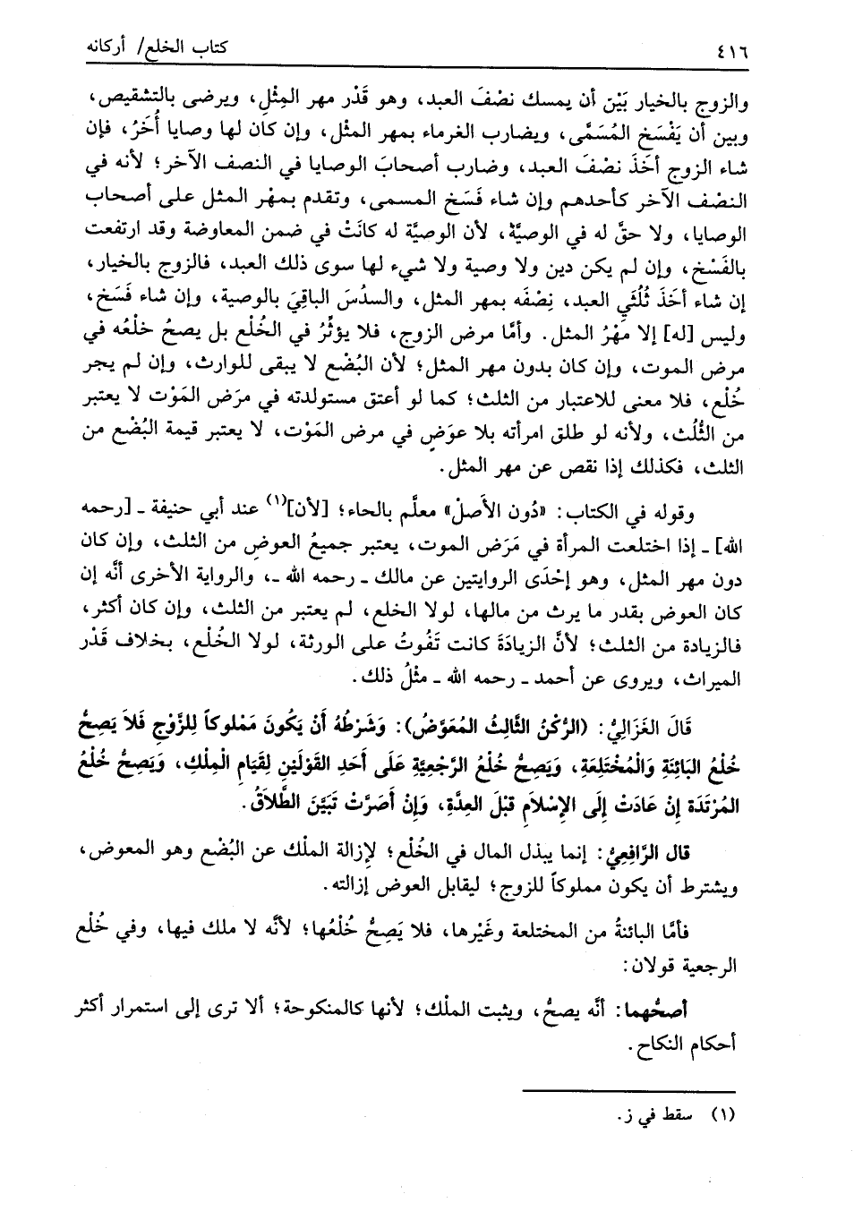 قَالَ الغَزَالِيُّ: (الرُّكْنُ الثَّالِثُ المُعَوَّضُ): وَشَرْطُهُ أَنْ يَكُونَ مَمْلوكاً لِلزَّوْجِ فَلاَ يَصِحُّ خُلْعُ البَائِنَةِ وَالْمُخْتَلِعَةِ، وَيَصِحُّ خُلْعُ الرَّجْعِيَّةِ عَلَى أَحَدِ القَوْلَيْنِ لِقَيَامِ الْمِلْكِ، وَيَصِحُّ خُلْعُ المُرْتَدَة إِنْ عَادَتْ إِلَى الإِسْلاَمِ قبْلَ العِدَّةِ، وَإِنْ أَصَرَّتْ تَبَيَّنَ الطَّلاَقُ.