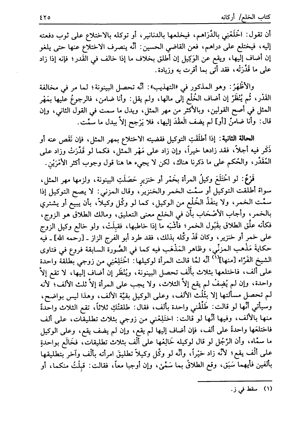 فَرْعٌ: لو اخْتَلَعَ وكيلُ المرأة بخَمْر أو خنزيرٍ حَصَلَتِ البينونة، ولزمها مهر المثل، سواءٌ أطلقت التوكيل أو سمَّت الخمر والخنزير، وقال المزني: لا يصح التوكيل إذا سمَّت الخمر، ولا ينفَذُ الخُلْع من الوكيل، كما لو وكَّل وكيلاً، بأن يبيع أو يشتري بالخمر، وأجاب الأصْحَاب بأن في الخلع معنى التعليق، ومالك الطلاق هو الزوج، فكأنه علَّق الطلاق بقَبُول الخمر؛ فأشْبَه ما إذا خاطبها، فقبِلَتْ، ولو خالع وكيل الزوج على خمر أو خنزير، وكان قَدْ وكَّله بذلك، فقد طرد أبو الفرج الزاز -[رحمه الله]- فيه حكايةَ مَذْهب المزنِّي، وظاهر المَذْهَب فيه كما في الصُّورة السابقة فروع في فتاوى الشيخ الفَرَّاء [منها] (¬1) أنَّه لمَّا قالت المرأة لوكيلها: احْتَلِعْنِي من زوجي بطلقة واحدة على ألف، فاختلعها بثلاث بأَلْف تحصل البينونة، ويُنْظَر إن أضاف إليها, لا تقع إلاَّ واحدة، وإن لم يُضِفْ لم يقع إلاَّ الثلاث، ولا يجب على المرأة إلاَّ ثلث الألف؛ لأنه لم تحصل مسألتها إلا بثُلُث الألف، وعلى الوكيل بقيَّة الألف، وهذا ليس بواضح، وسيأتي أنَّها لو قالت: طَلِّقْني واحدة بألف، فقال: طلقتُكِ ثلاثاً، تقع الثلاث واحدةً منها بالألف، وفيها أنَّها لو قالت: اختَلِعْني من زوجي بثلاث تطليقات، على ألف فاختلعَها واحدةً على ألف، فإن أضاف إليها لم يقع، وإن لم يضف يقع، وعلى الوكيل ما سمَّاه، وأن الرَّجُل لو قال لوكيله خَالِعْها على ألْف بثلاث تطليقات، فخَالَع بواحدةٍ على ألْف يقع؛ لأنَّه زاد خيراً، وأنَّه لو وكَّل وكيلاً تطليقَ امرأته بألْف وآخر بتطليقها بألفين فأيهما سَبَق، وقع الطلاقُ بما سَمَّى، وإن أوجبا معاً، فقالت: قبِلْتُ منكما، أو