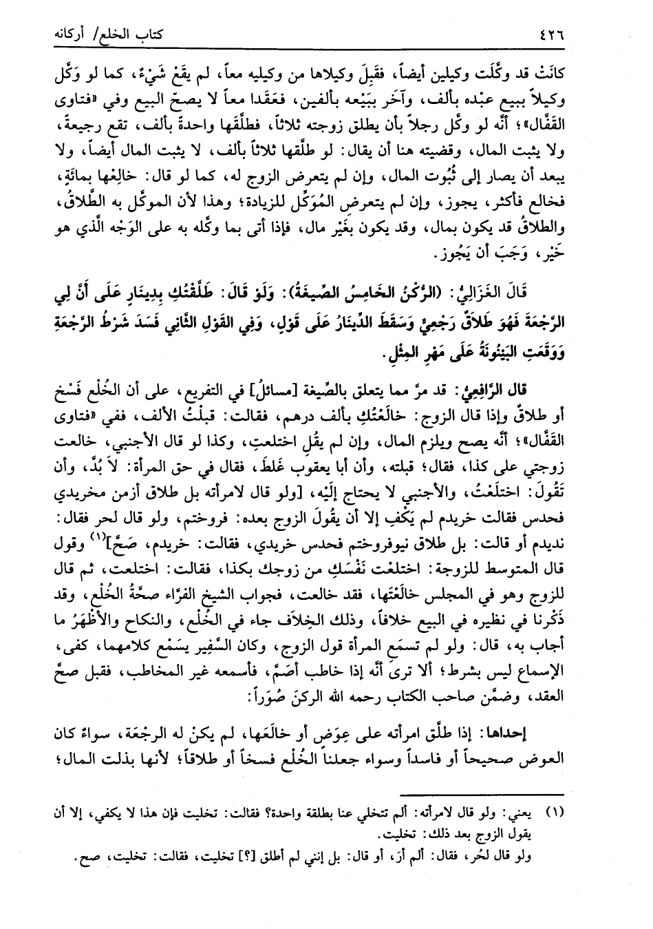 قَالَ الغَزَالِيُّ: (الرُّكْنُ الخَامِسُ الصِّيغَةُ): وَلَوْ قَالَ: طَلَّقْتُكِ بِدِينَارٍ عَلَى أَنَّ لِي الرَّجْعَةَ فَهُوَ طَلاَقٌ رَجْعِيٌّ وَسَقَطَ الدِّينَارُ عَلَى قَوْلٍ، وَفِي القَوْلِ الثَّانِي فَسَدَ شَرْطُ الرَّجْعَةِ وَوَقَعَتِ البَيْنُونَةُ عَلَى مَهْرِ المِثْلِ.