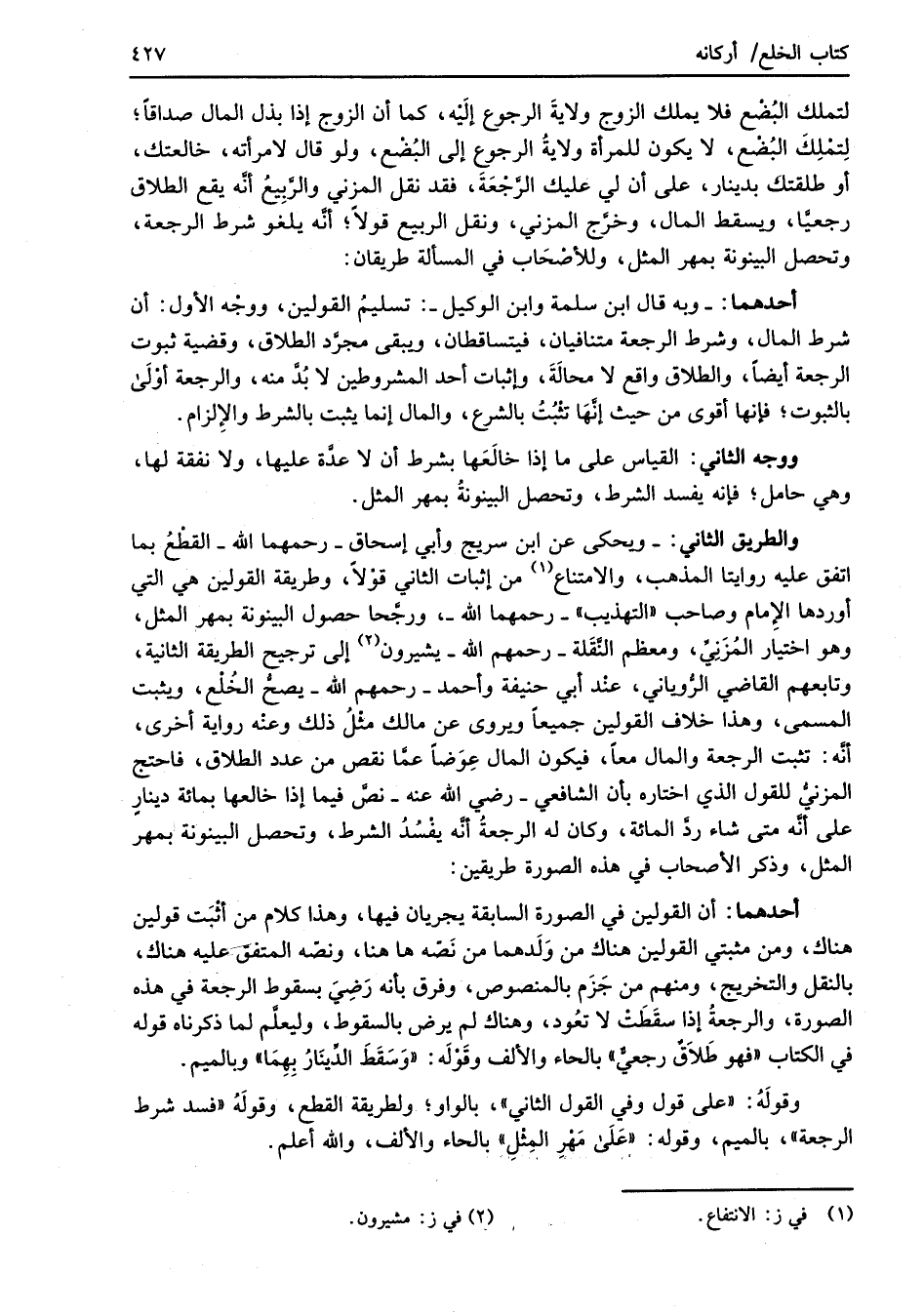 أحدهما: -وبه قال ابن سلمة وابن الوكيل-: تسليمُ القولين، ووجْه الأول: أن شرط المال، وشرط الرجعة متنافيان، فيتساقطان، ويبقى مجرَّد الطلاق، وقضية ثبوت الرجعة أيضاً، والطلاق واقع لا محالَةَ، وإثبات أحد المشروطين لا بُدَّ منه، والرجعة أوْلَى بالثبوت؛ فإنها أقوى من حيث إنَّهَا تثْبُتُ بالشرع، والمال إنما يثبت بالشرط والإِلزام.