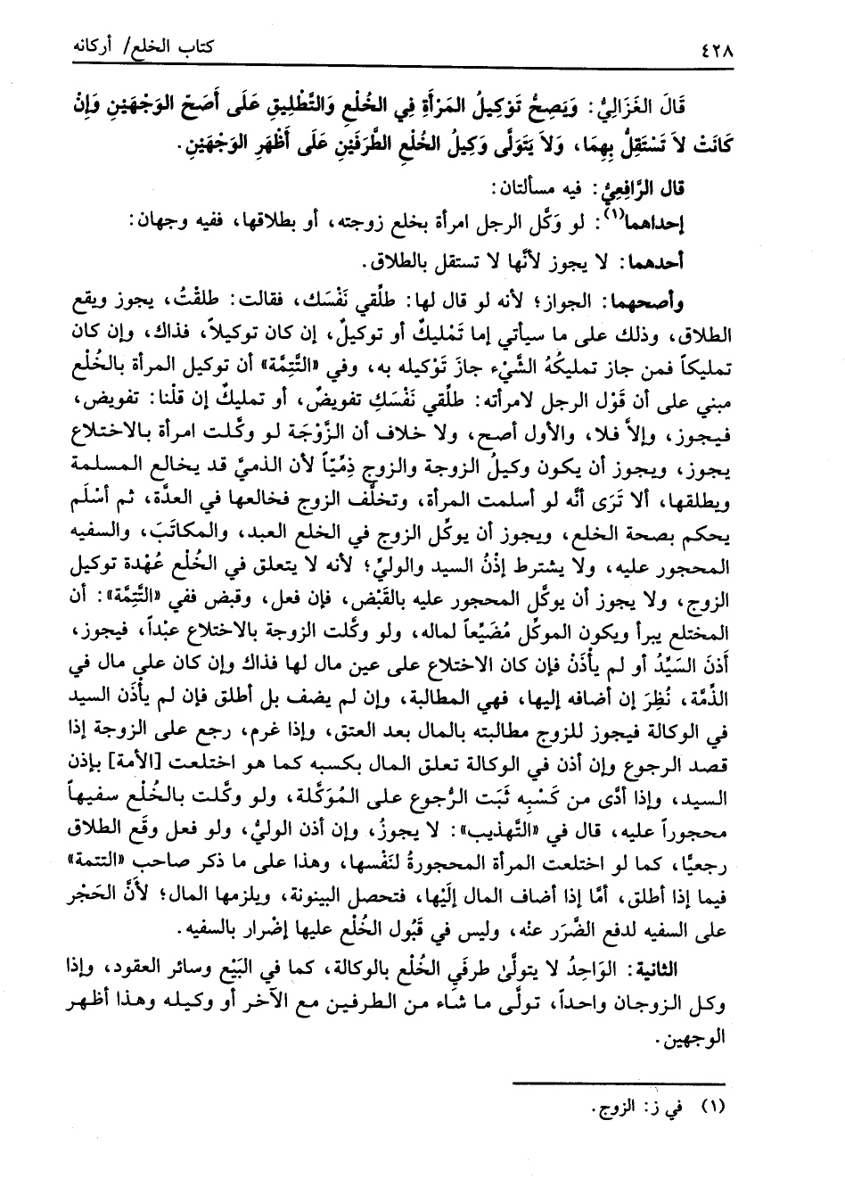 قَالَ الغَزَالِيُّ: وَيَصِحُّ تَوْكِيلُ المَرْأَةِ في الخُلْعِ وَالتَّطْلِيقِ عَلَى أَصَحِّ الوَجْهَيْنِ وَإِنْ كَانَتْ لاَ تَسْتَقِلُّ بِهِمَا، وَلاَ يَتَوَلَّى وَكِيلُ الخُلْعِ الطَّرَفَيْنِ عَلَى أَظْهَرِ الوَجْهَيْنِ.