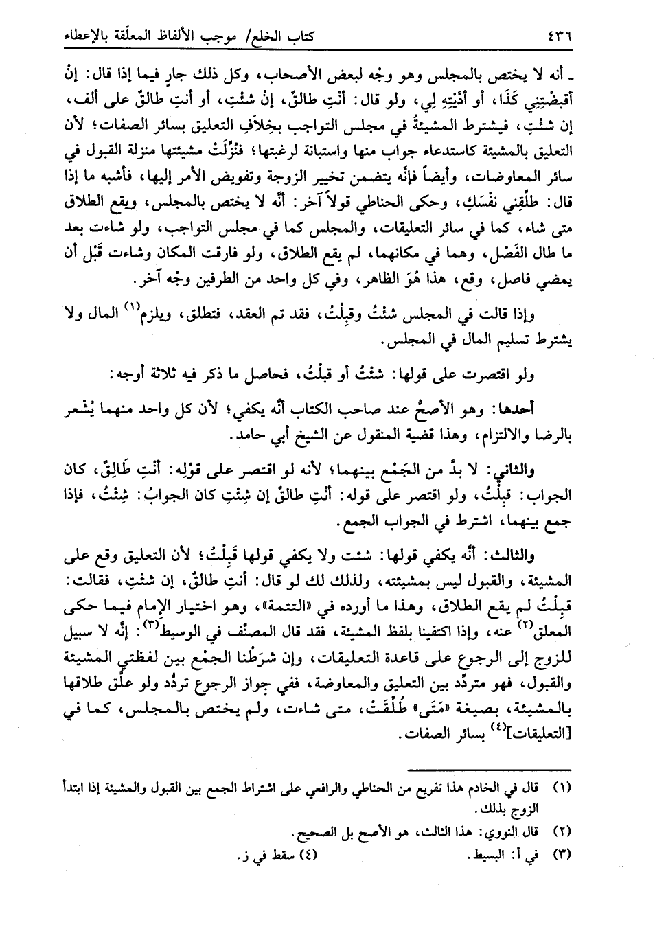 - أنه لا يختص بالمجلس وهو وجْه لبعض الأصحاب، وكل ذلك جارٍ فيما إذا قال: إنْ أقبضْتِنِي كَذَا، أو أدَّيْتِهِ لِي، ولو قال: أنْتِ طالقٌ، إنْ شئْتِ، أو أنتِ طالقٌ على ألف، إن شئْتِ، فيشترط المشيئةُ في مجلس التواجب بخِلاَفِ التعليق بسائر الصفات؛ لأن التعليق بالمشيئة كاستدعاء جواب منها واستبانة لرغبتها؛ فنُزِّلَتْ مشيئتها منزلة القبول في سائر المعاوضات، وأيضاً فإنَّه يتضمن تخيير الزوجة وتفويض الأمر إليها، فأشبه ما إذا قال: طلِّقِني نفْسَكِ، وحكى الحناطي قولاً آخر: أنَّه لا يختص بالمجلس، ويقع الطلاق متى شاء، كما في سائر التعليقات، والمجلس كما في مجلس التواجب، ولو شاءت بعد ما طال الفَصْل، وهما في مكانهما، لم يقع الطلاق، ولو فارقت المكان وشاءت قَبْل أن يمضي فاصل، وقع، هذا هُوَ الظاهر، وفي كل واحد من الطرفين وجْه آخر.