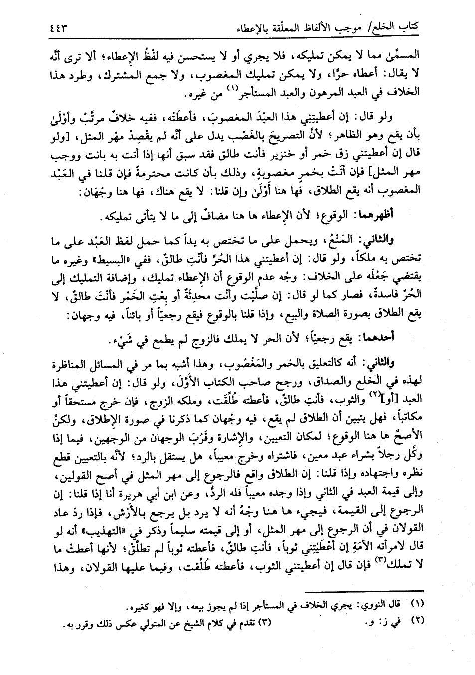 المسمَّى مما لا يمكن تمليكه، فلا يجري أو لا يستحسن فيه لفْظُ الإِعطاء؛ ألا ترى أنَّه لا يقال: أعطاه حرَّا, ولا يمكن تمليك المغصوب، ولا جمع المشترك، وطرد هذا الخلاف في العبد المرهون والعبد المستأجر (¬1) من غيره.